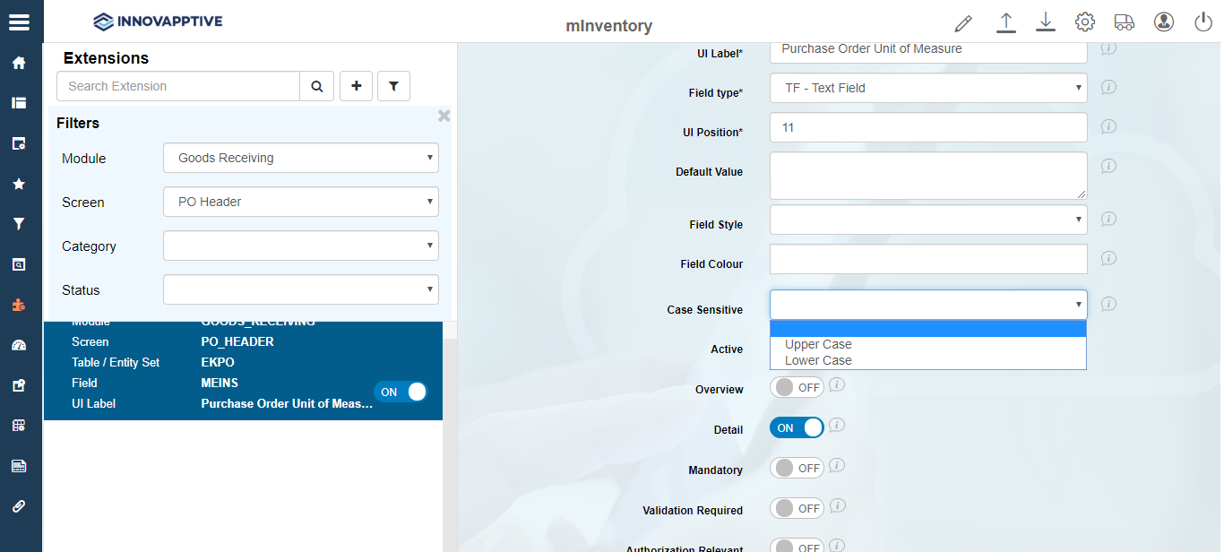 values like unit of measure, plant and batch to be posted in lower case or upper case.