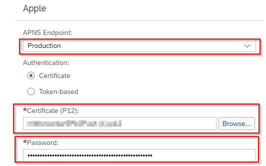 • iOS Device: Scroll to option Apple and change the APNS Endpoint from None to Sandbox/Production based on the certificate type. Upload Certificate and save the settings.