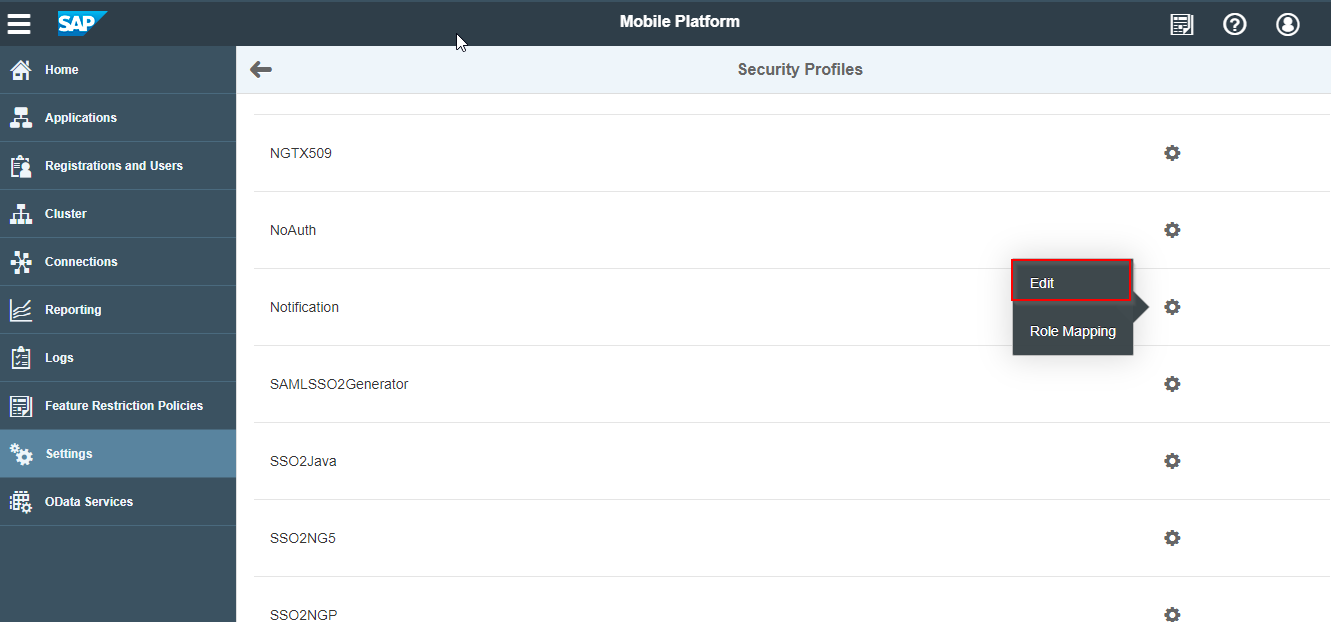 - In the Security Profiles screen, click the settings icon next to Notification.