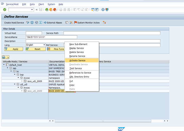 - Right-click RACE_UI5_2009 and click Activate Service.