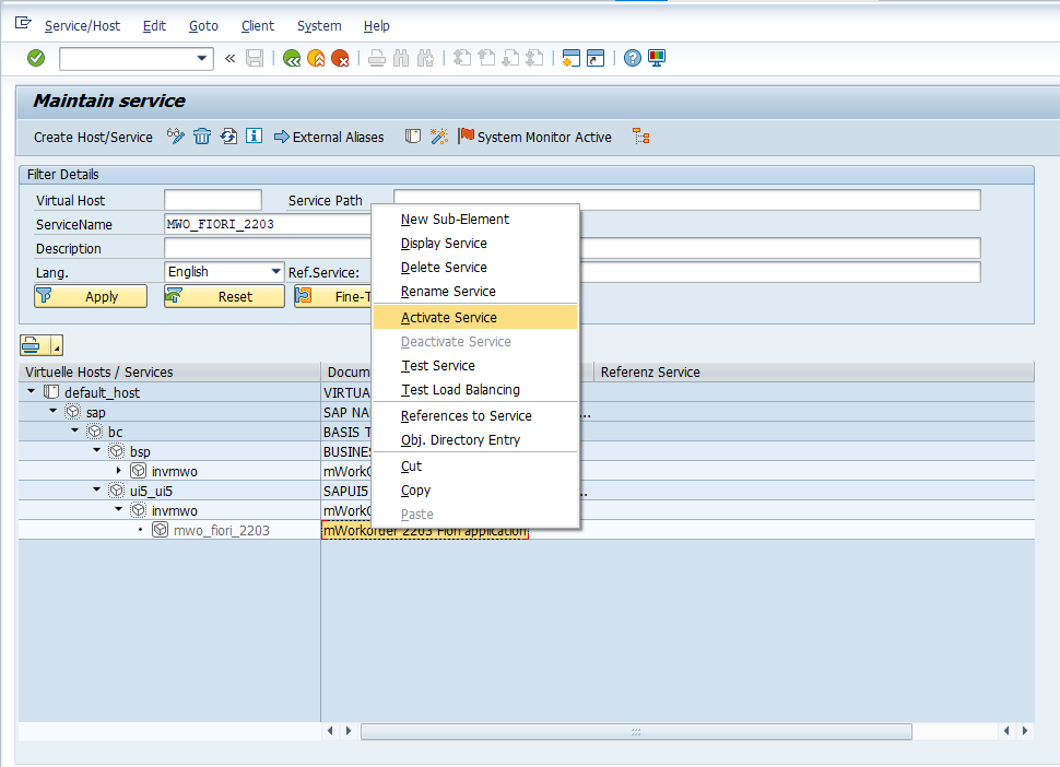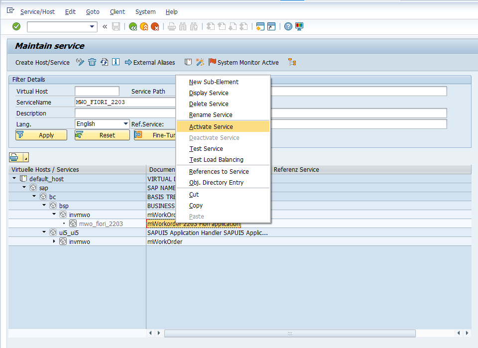 Right-click the mWorkOrder 2203 FIORI service under default_host >