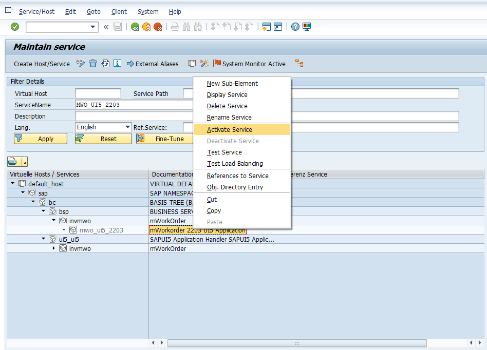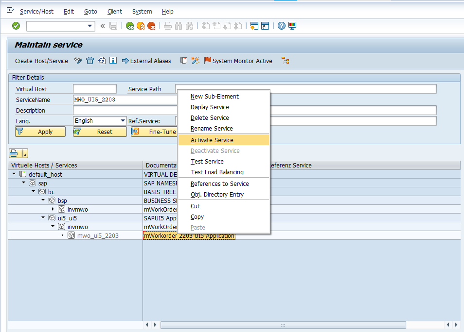 Right-click the mWorkOrder 2203 UI5 service under default_host >
