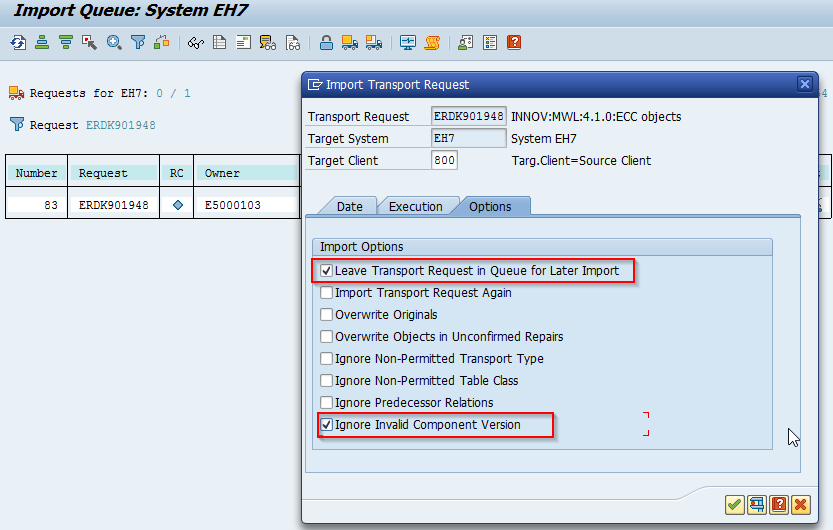 - Select Leave Transport Request in Queue for Later Import and Ignore Invalid Component Version.