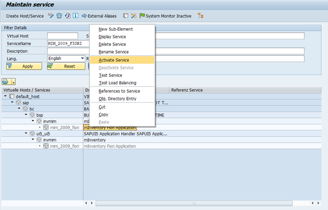 Right-click the minv_fiori_2009 service under default_host > sap > bc > bsp