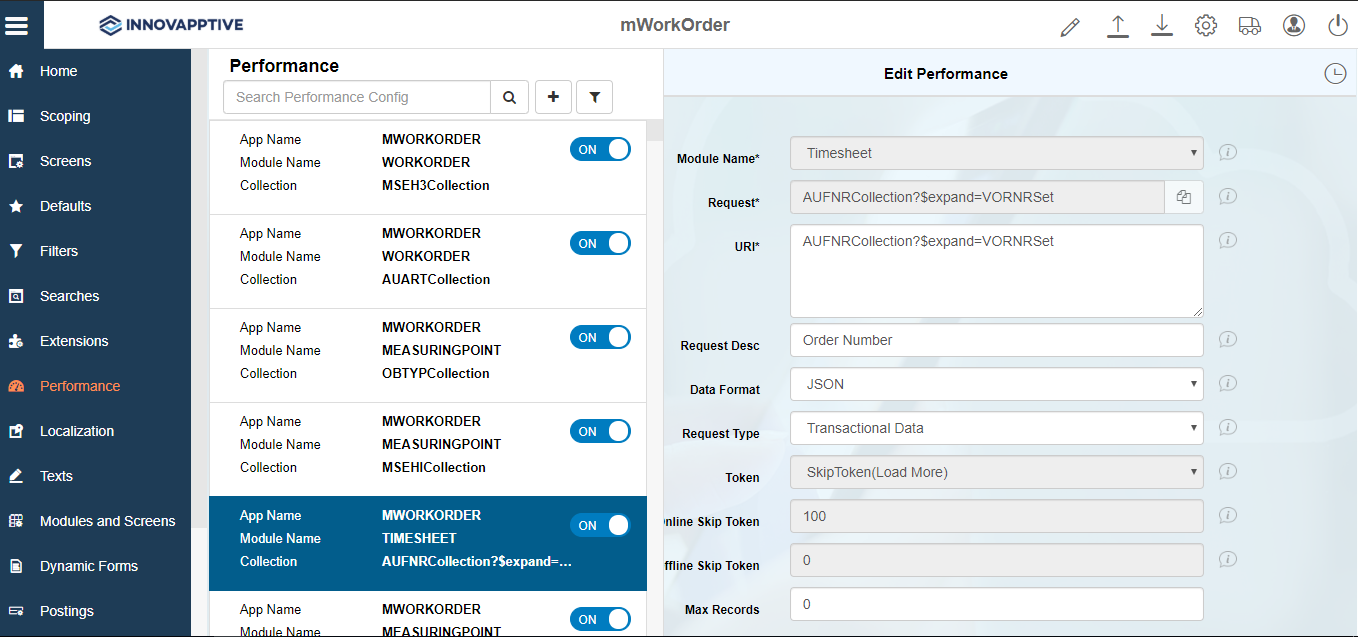 Access Value This field is used for data related to security. Based on the access category, data in this field needs to be maintained. For example, if you maintain a transaction code in the Access Category field then you must enter the t-code name in this field. Module/feature is displayed in the mobile application only if the user has access to the transaction code. Figure 1. Performance configuration