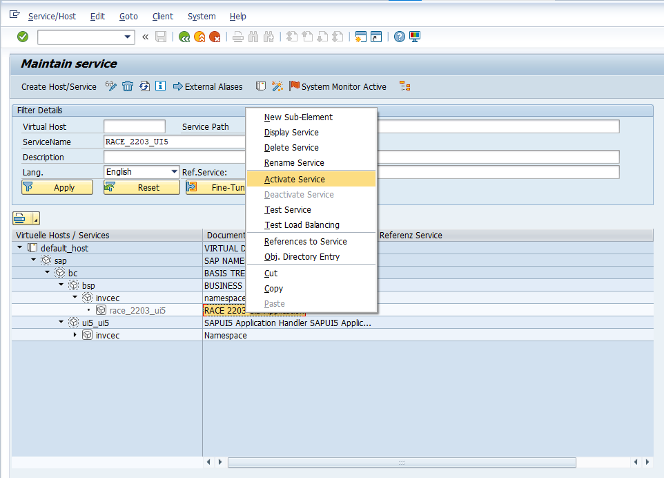 - Right-click RACE 2203 UI5 and click Activate Service.