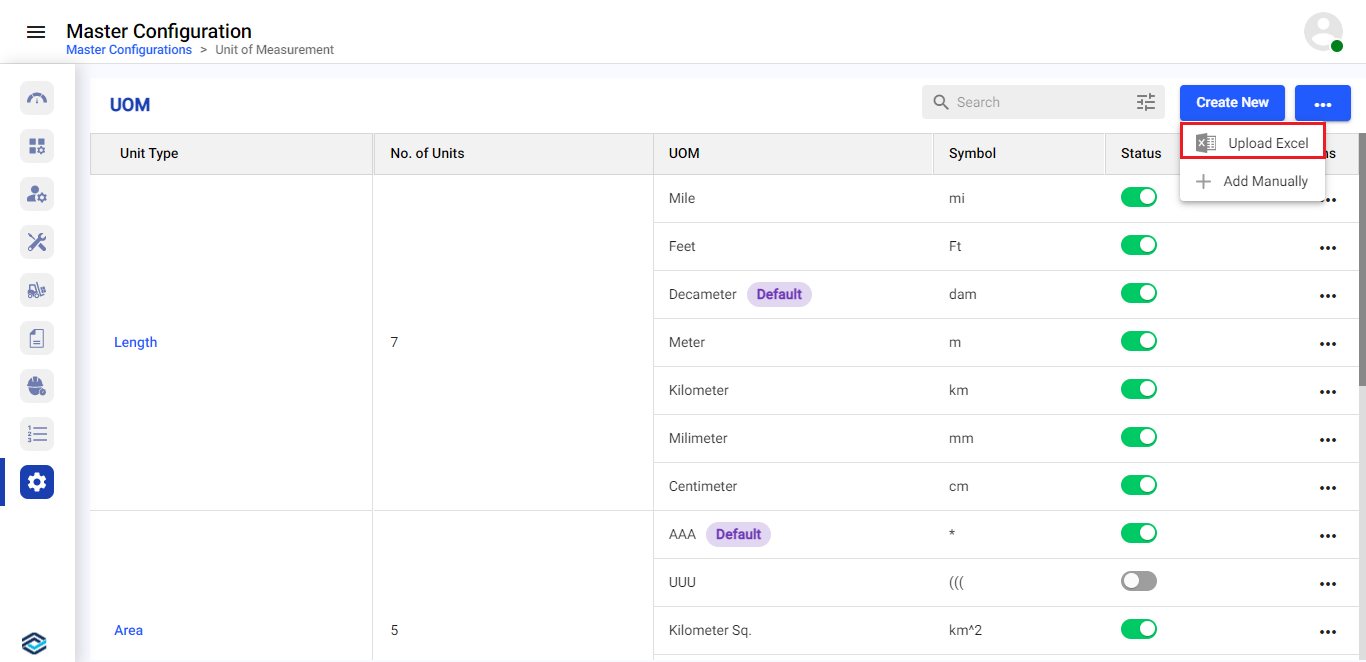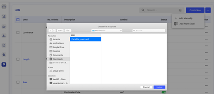 When you want to create many units of measurements, you can bulk upload the master data for UOM by uploading an excel sheet with the details of the unit of measurement, unit of measurement type and symbol to avoid repetitive activity. The name of the excel sheet must be Bulk Upload - UOM Template.xlsx.