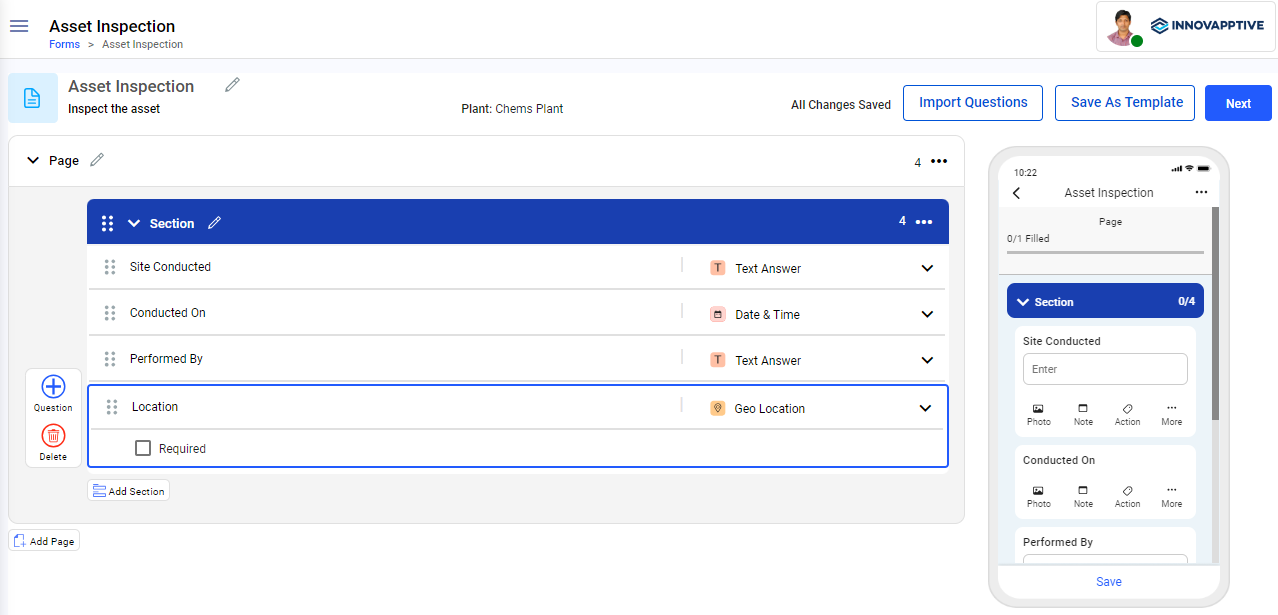Create forms with pages, sections, and questions within sections, and publish them. Technicians use the published forms while conducting inspections to fill data and submit them based on the use case using the mobile application.