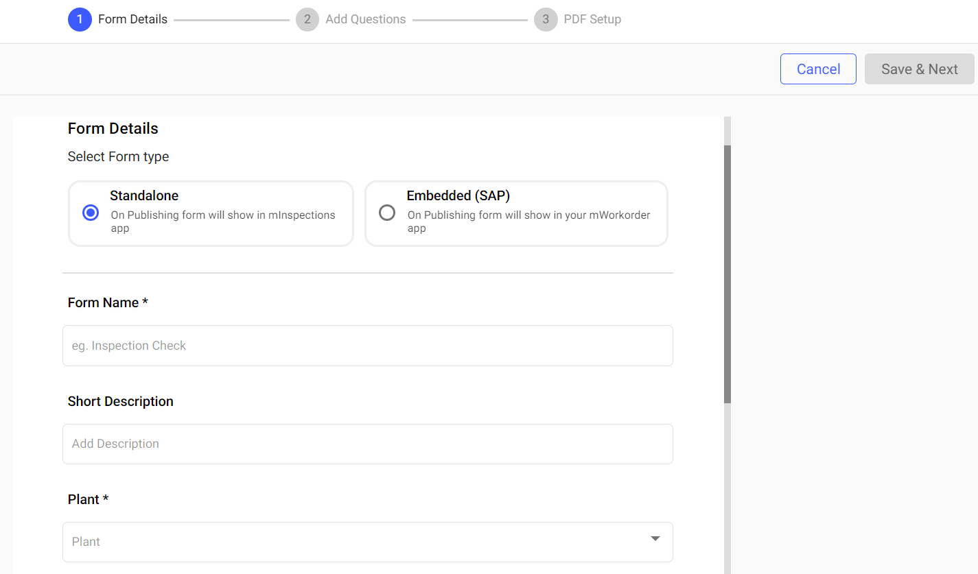 Table 1. Form Details Screen Fields Field Description Form Type Select form type Standalone or Embedded. Note:If you select Standalone, the form is displayed in the mInspections application after publishing.
