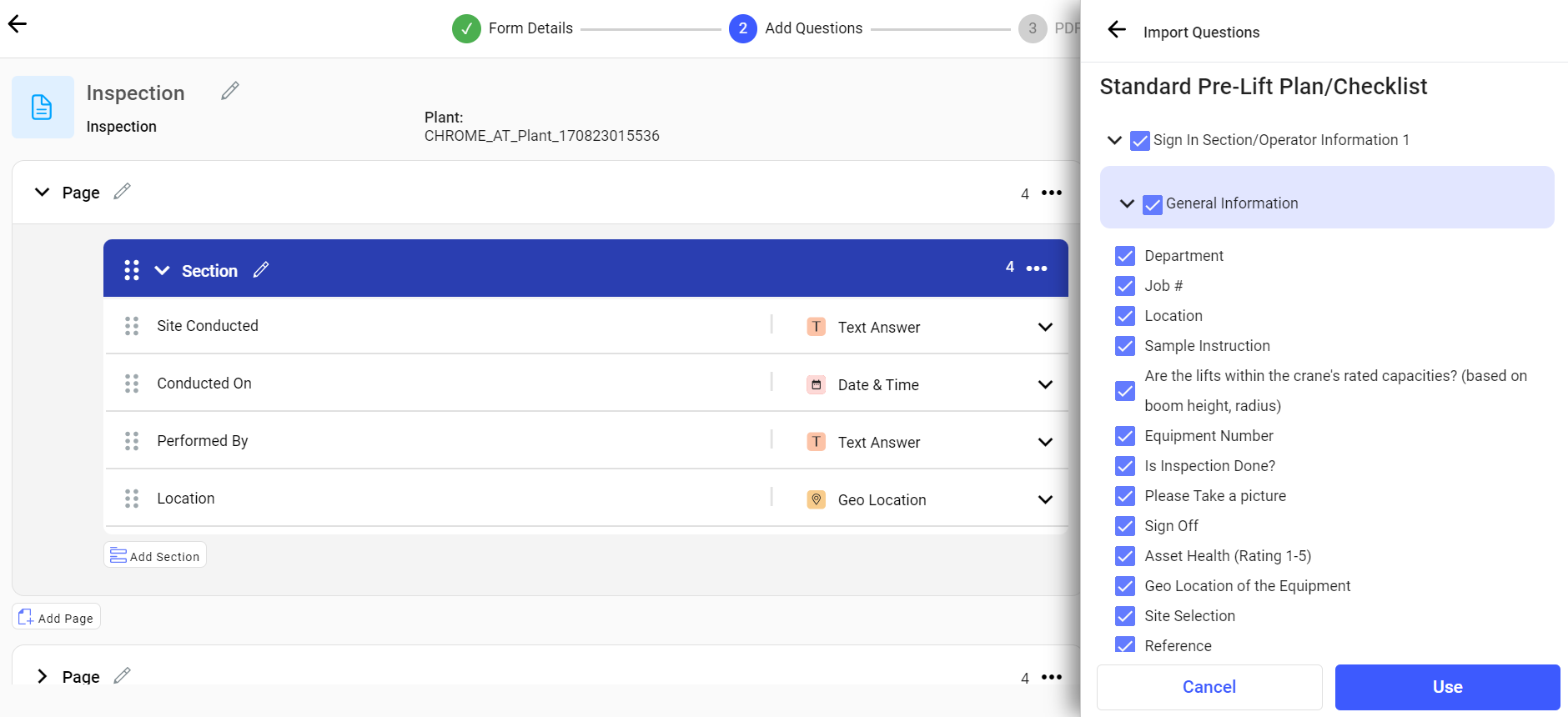 Figure 2. Import QuestionsA pop-up with create a new page/section or import to the current