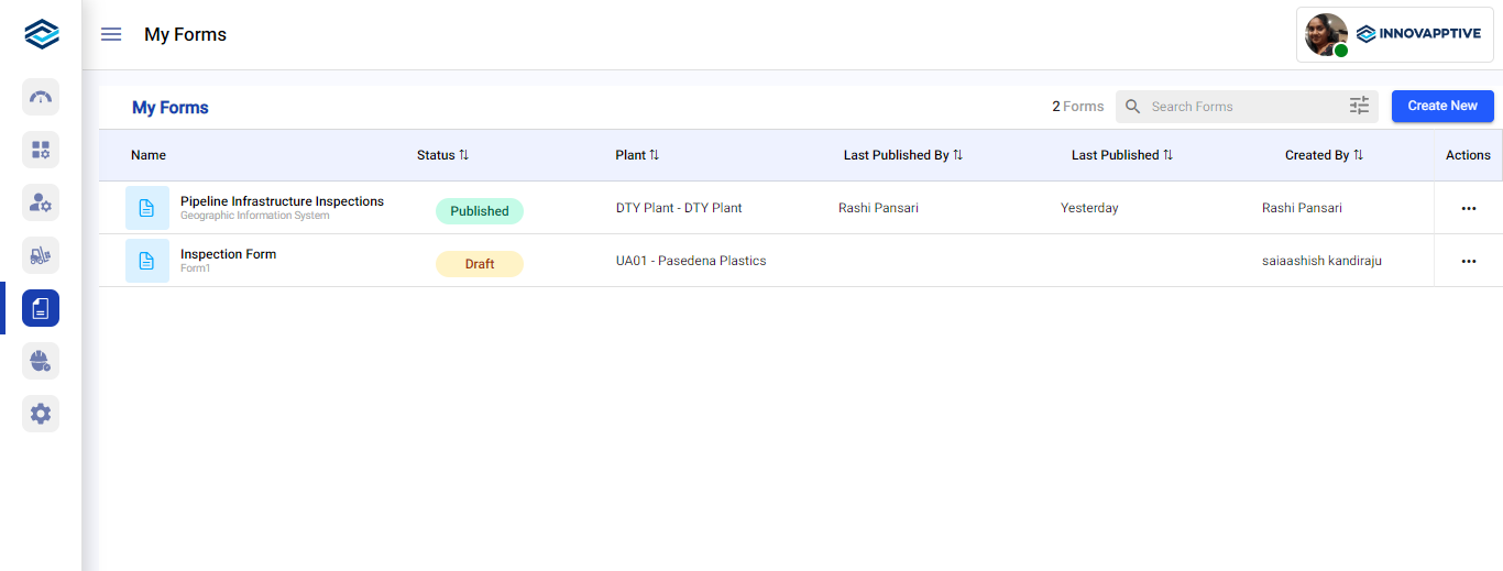 - Inspections: The Inspections tab lists all the scheduled forms that are in Open, In-Progress, and Completed status. It also lists forms that are unassigned to technicians. Forms that are assigned to the technicians and later unassigned are displayed with a partly open status. You can view forms, form details, and inspections. You can also search and filter scheduled forms.