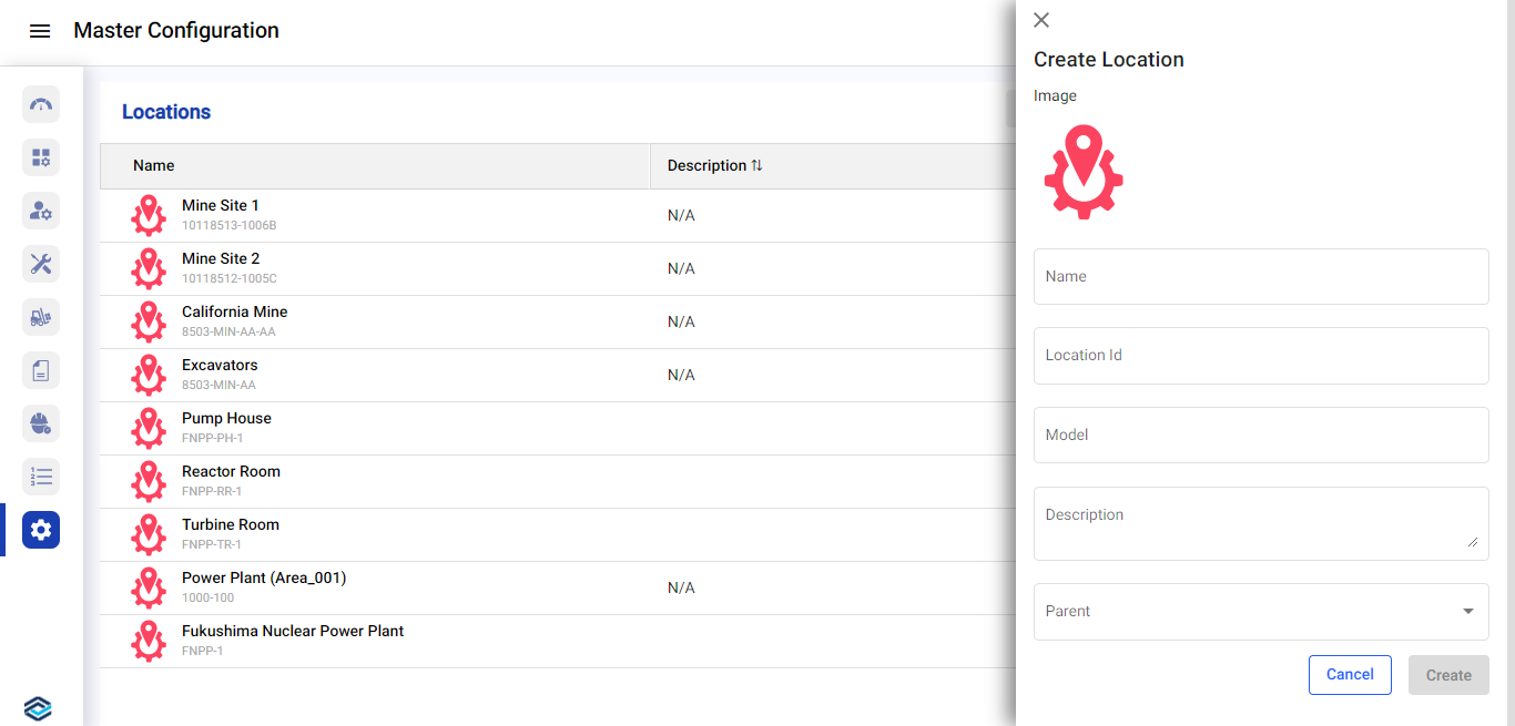 - In the Create Location window, enter location details like Name, Location Id, Model, Description, and Parent.