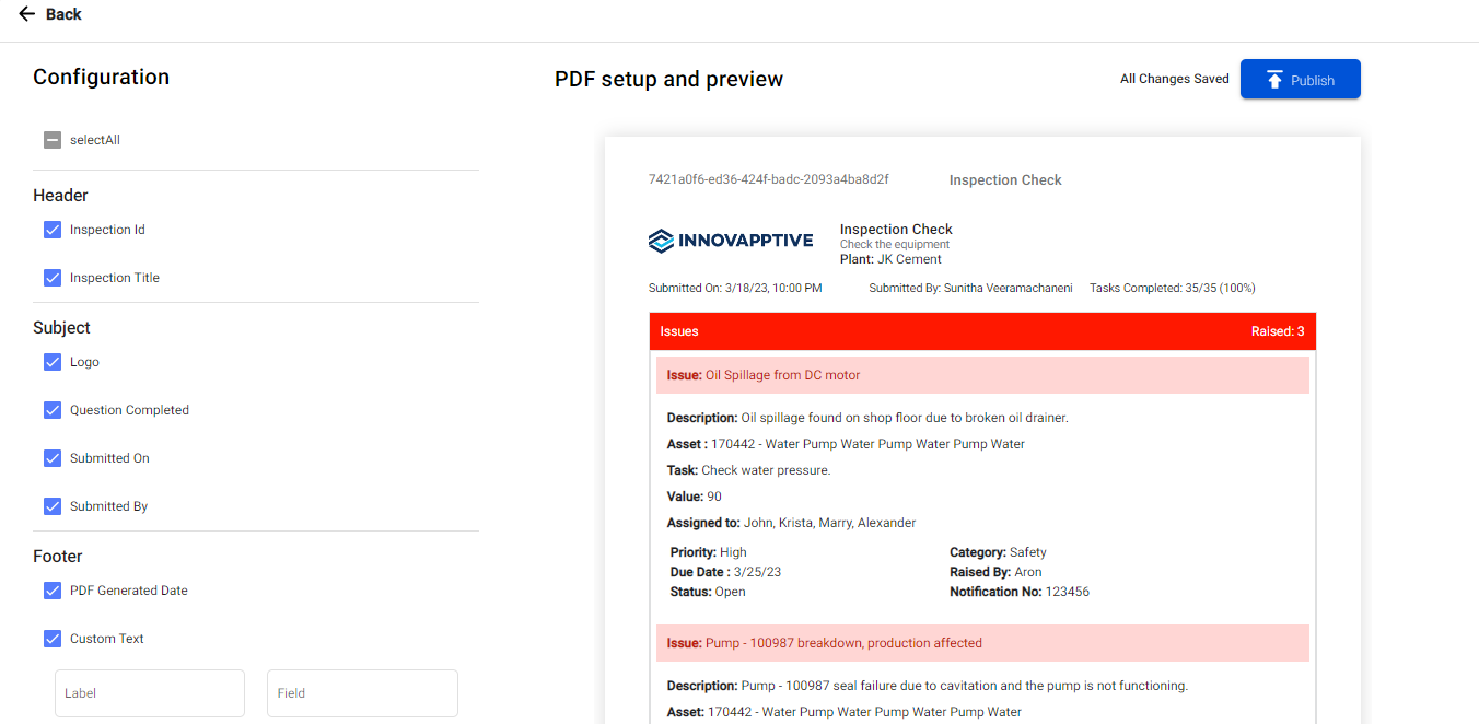 Create forms with pages, sections, and questions within sections, and publish them. Technicians use the published forms while conducting inspections to fill data and submit them based on the use case using the mobile application.