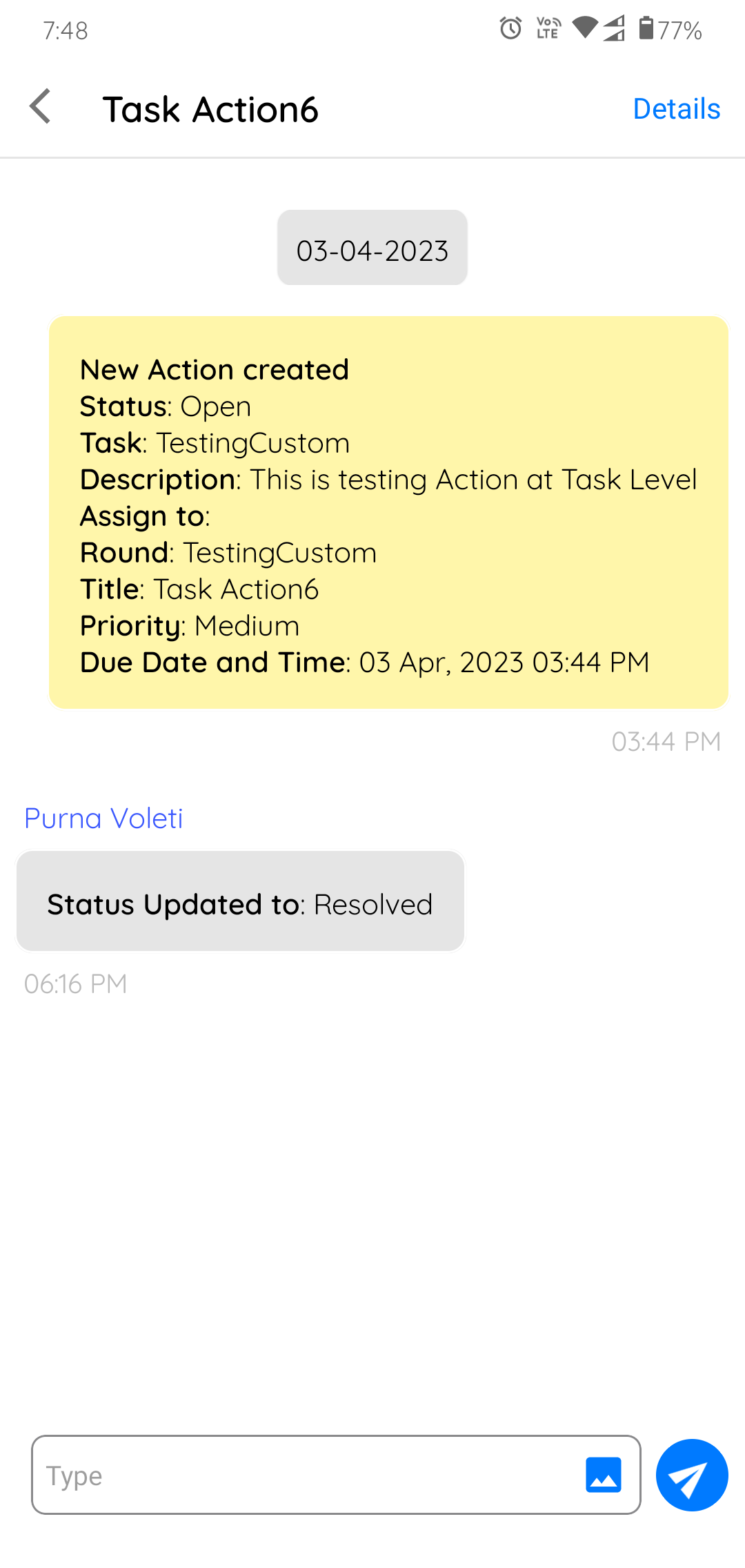 Note: You can change the status from Resolved to Open if that action is not yet resolved even after following up on it. Any photos that are attached in the chat box will appear under the Photo form field. But photos attached in the Photo form field will not be displayed in the chat box. - Tap the Save button.