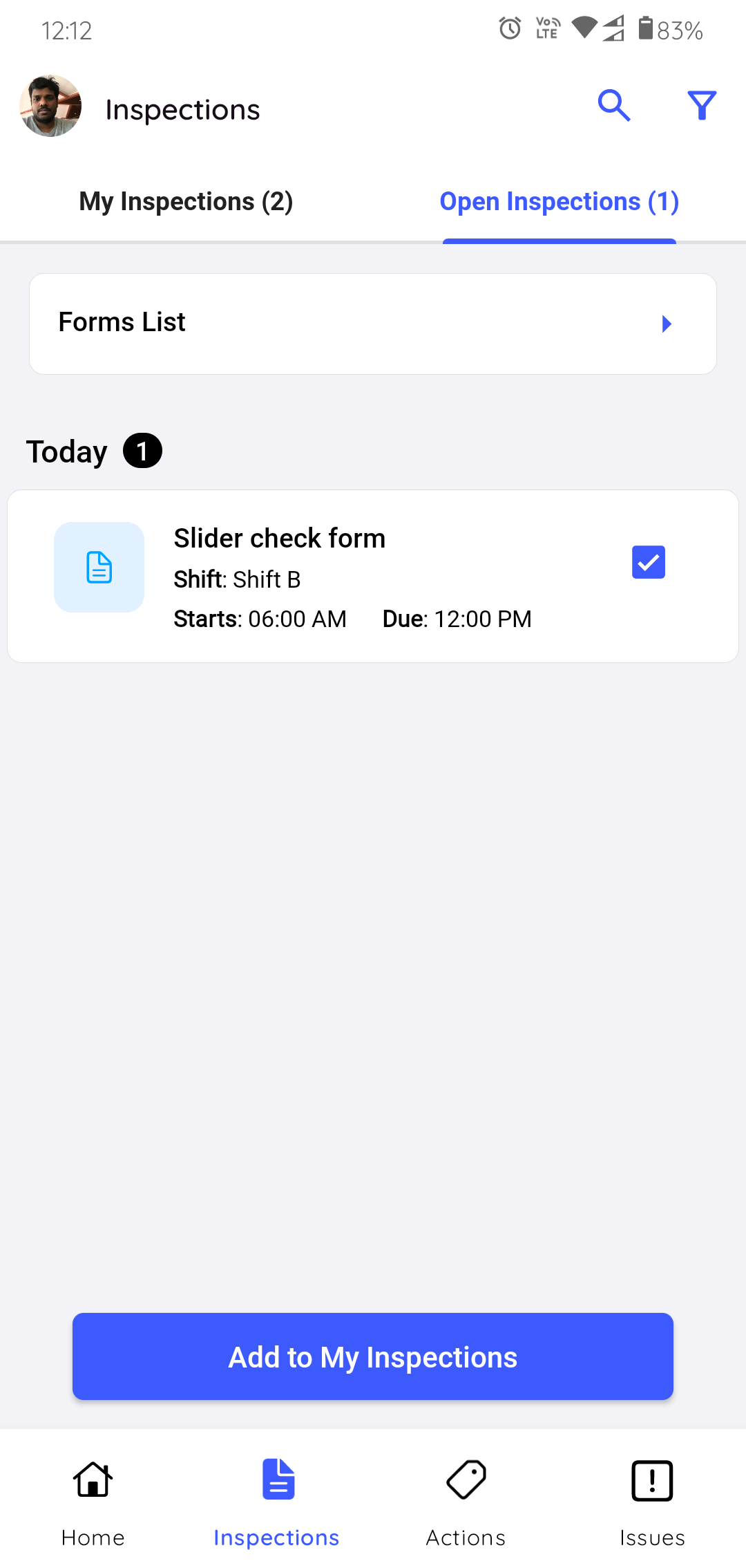 Apart from the inspections that are seen in the My Inspections tab, you can assign an unassigned inspection that is available in the Open Inspections tab to yourself and fill the questions in them.