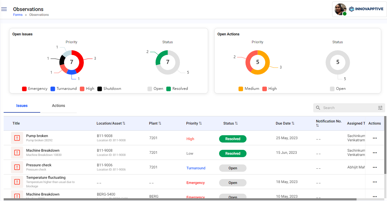 in doughnut charts, categorized by their priority and status.Figure 1. Observations Screen