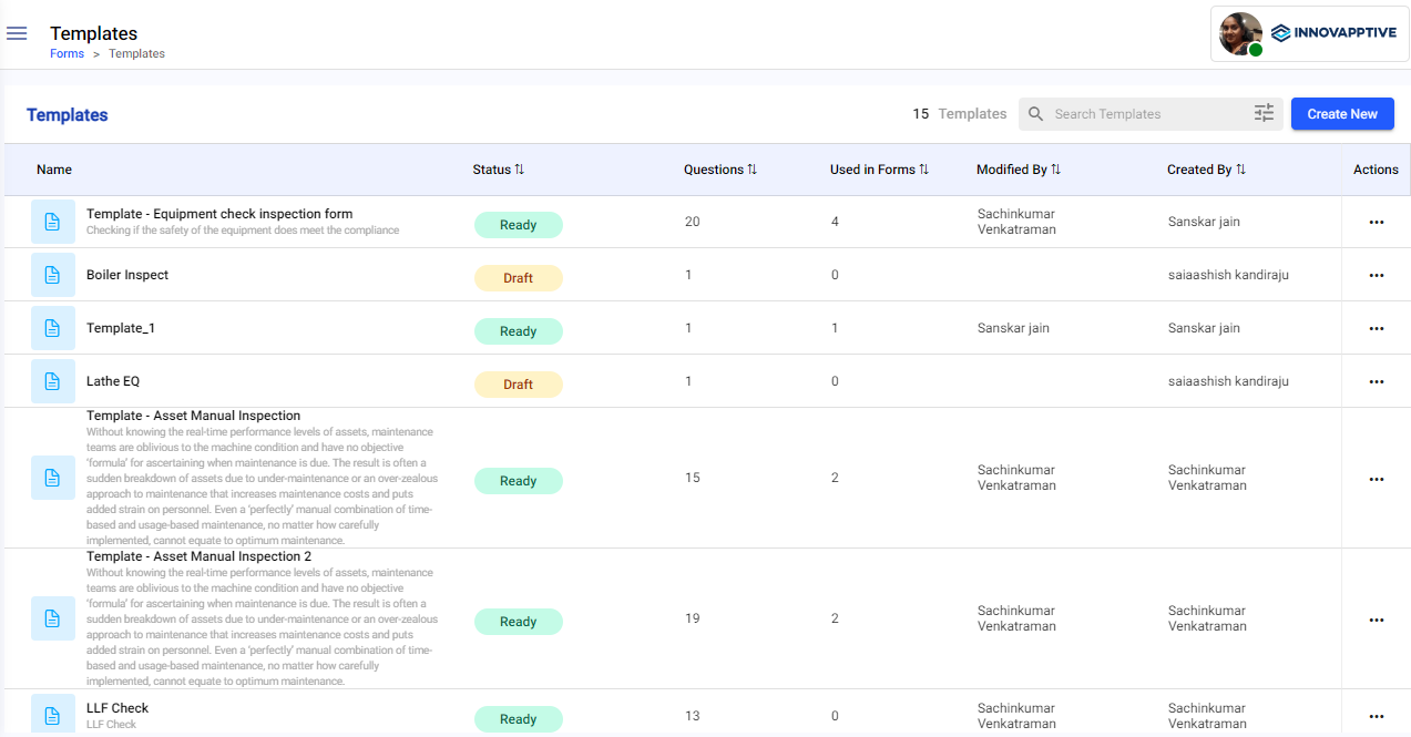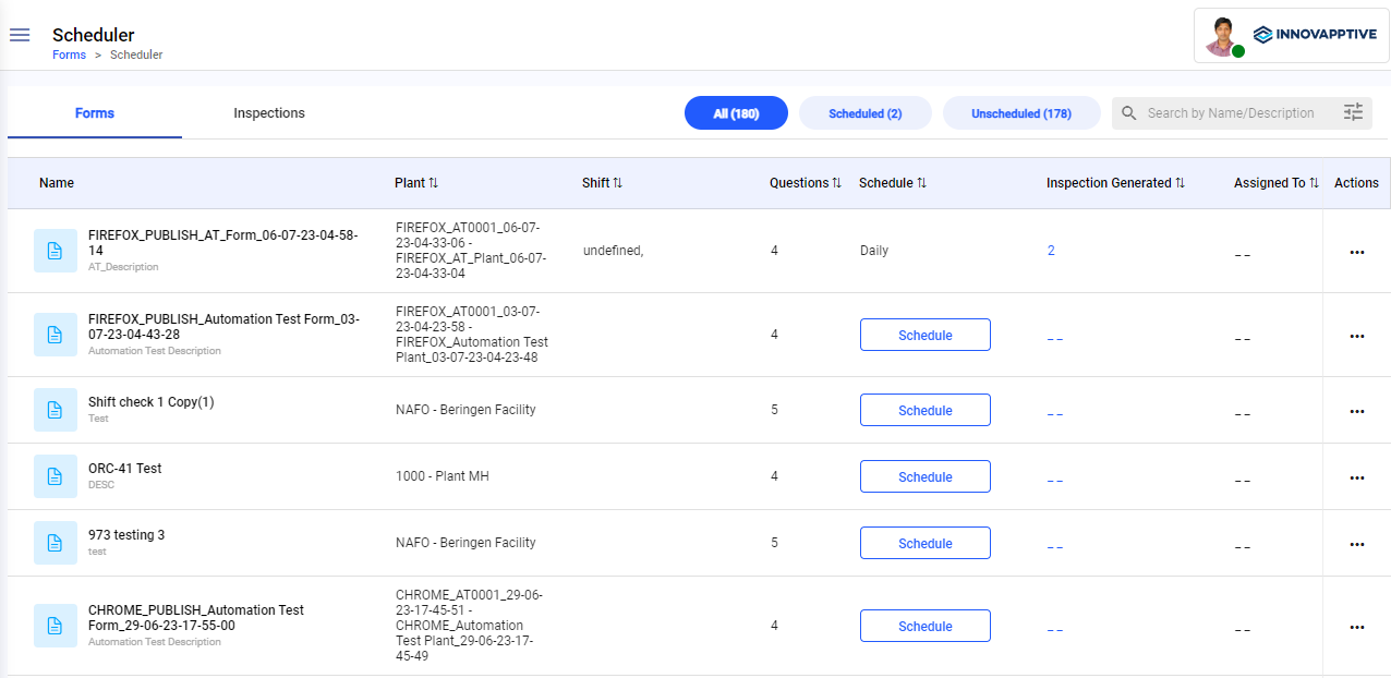 - Inspections: The Inspections tab lists all the scheduled forms that are in Open, In-Progress, and Completed status. It also lists forms that are unassigned to technicians. Forms that are assigned to the technicians and later unassigned are displayed with a partly open status. You can view forms, form details, and inspections. You can also search and filter scheduled forms.