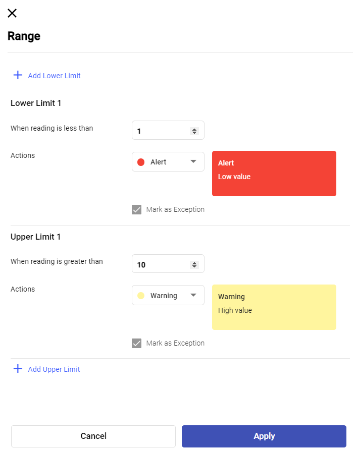 - Click Add Lower Limit and Add Upper Limit to add multiple lower and upper limit values.