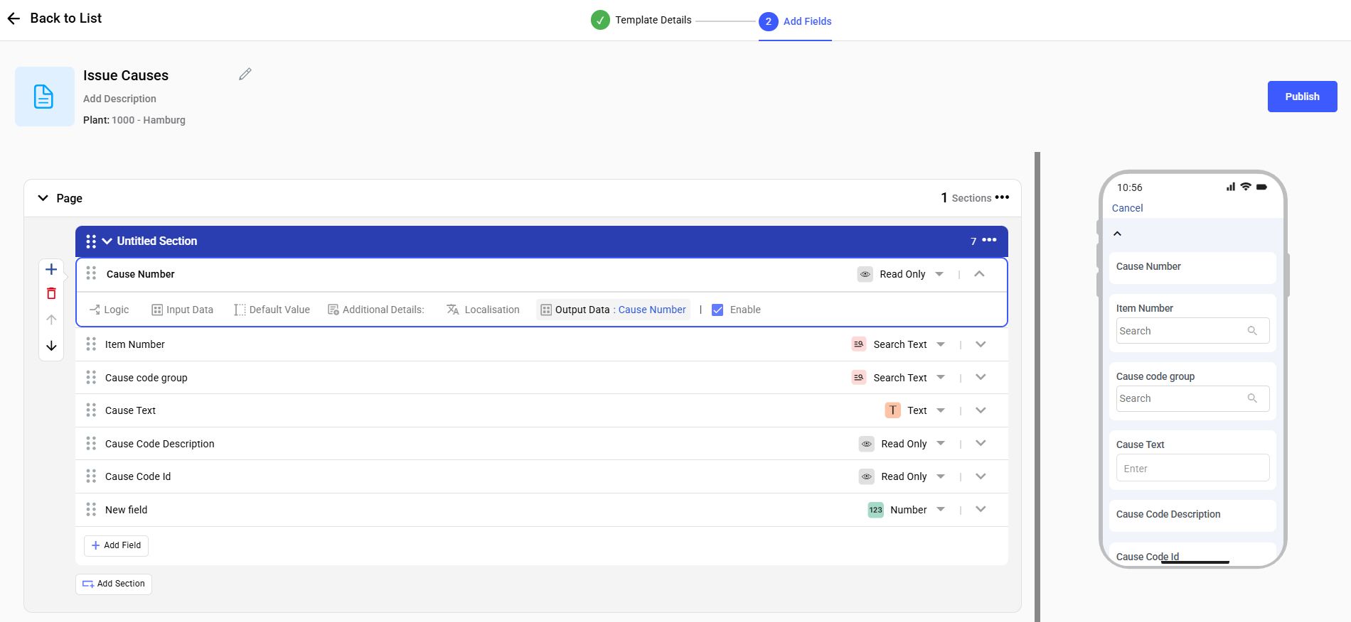 Field Behavior Cause number Auto incremental value; Read Only Field Item number Drop-down with search Cause code group Drop-down with search Cause code Auto-populates from Code group; Read Only Cause text Text Field