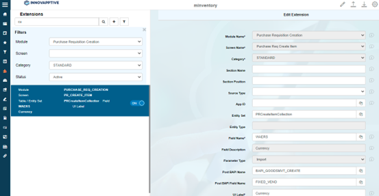 Field Description Module Name Purchase Requisition Creation Screen Name Purchase Req Create Item Category Standard Entity Set PRCreateItemCollection Field Name WAERS Field Description Currency Parameter Type Import Post BAPI Name BAPI_GOODSMVT_CREATE Post BAPI Field Name FIXED_VEND UI Label Currency Field Type DD – Drop Down UI Position 8 Active ON Overview ON Detail ON Mandatory OFF -