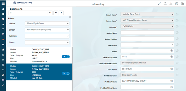 Table 1. Goods Received Date Configuration Field Description Module Name Material Cycle Count Screen Name MAT Physical Inventory Items Category EXTENSION Table / BAPI Name S032 Table / BAPI Description Document Segment Material Field Name LETZTZUG Field Description Date Last Receipt Post BAPI Name BAPI_MATPHYSINV_COUNT UI Label Last GR Date Field Type DL – Date Label UI Position 23 Active ON Overview ON Detail ON Mandatory OFF Authorization Relevant OFF Parent Table /INVMIM/PHYSINV_ITEMS_LIST_S Parent Key MATNR, WERKS, LGORT Validation Required OFF -