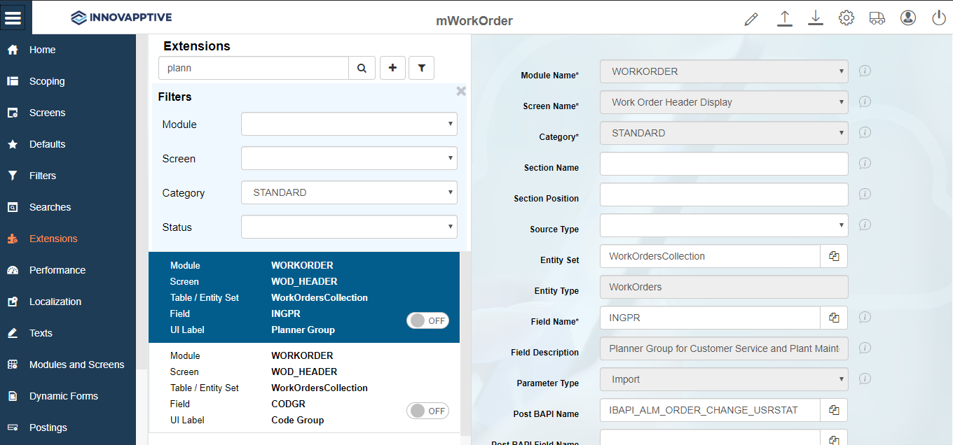 Entity Set Collection to which the Standard field belongs. Note:Auto-populated based on Module and Screen selected if the Category field is set to Standard.Entity Type Auto-populated based on Module and Screen selected if the Category field is set to Standard. Table / BAPI Name Select the table/BAPI to fetch the data from. Note:This field is applicable only if you selected Extension in the Category field.Table / BAPI Description Auto-populated based on Table / BAPI Name. Note:This field is applicable only if you selected Extension in the Category field.Field Name Select the table/BAPI field to retrieve the field data. Field Description Populated based on the Field Name. UI Label Enter the text to be shown on the application UI. Field Type Define the type of the field. Following are a few of the UI field types available for mWorkOrder: Table 2. UI Field Types Field Type ID Field Type LF Label Field DL Date Label CB Check Box DD Drop Down DF Date Field TF Text Field SF Scan Field OCR Optical Character Recognition ID Input Drop Down DDR Drop Down Range DFR Date Field Range TFR Text Field Range NF Numeric Field NFR Numeric Field Range IDR Input Drop Down Range CL Check Label LV Long Text View LT Long Text NID Numeric Input Drop Down NDR Numeric Input Drop Down Range SID Scan Input Drop Down DDM Drop Down Multi Selection TFM Text Field Multi Selection IDM Input Drop Down Multi Selection GAL Geo Location Address Label GCL Geo Location Coordinates Label GAI Geo Location Address Input GCI Geo location Coordinates Input SGF Signature Field NDM Numeric Input Drop Down Multi Selection NFM Numeric Field Multi Selection UI Position Position for the extension compared to other fields on the transaction screen. Default Value Value to be populated in the extension field. Case Sensitive To show the extension field value in Uppercase or Lowercase. Active To show/hide the extension on the transaction screen. Overview Enable/disable the extension field in Overview section of the transaction screen. For example, header fields and line item fields in the Item Overview list screen are displayed in Overview section. Detail Enable/disable to show the extension in Detail section of the transaction screen. Mandatory To show the extension as Mandatory field on the transaction screen. Validation Required To configure validation rules for the extension field. UI Validation Specify the validations for user entered values. Note:This field is displayed only if the Validation Required is enabled.UI Validation Message Enter the alert message to be displayed if the UI validation is applicable. Note:This field is displayed only if the Validation Required is enabled.Authorization Relevant Enable/disable security authorization relevancy. This is relevant for fields of type ‘drop down’, and when activated, will filter values based on security org values set up in SAP security roles. Access Category Enable/disable extension field based on user access: - T-Transaction Code