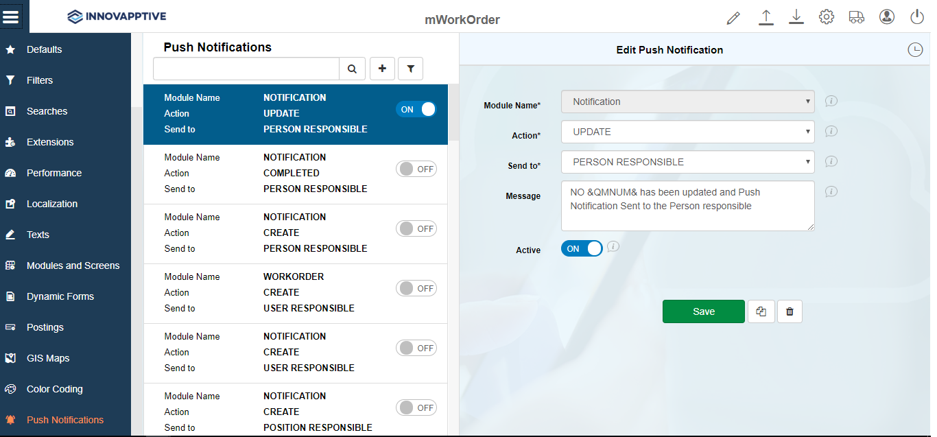 Use the Push Notifications menu to configure the push notifications actions and other attributes.