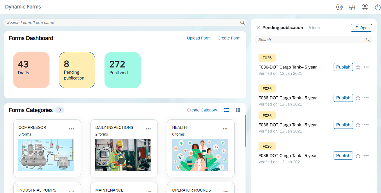 - Search for specific forms, view date when the form was verified, click Publish to view the preview (phone or tablet) of dynamic form and publish the form.