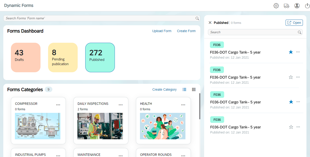 - Search for specific forms, view date when the form was published, click on the form to view the preview (phone or tablet) of dynamic form.