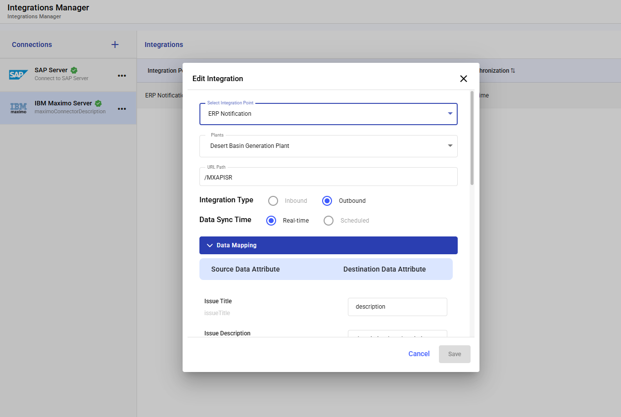 Configuration is managed through the Integrations Manager interface where you establish a secure server connection and configure individual integration points with endpoint paths and field mapping for master data synchronization and notification creation.