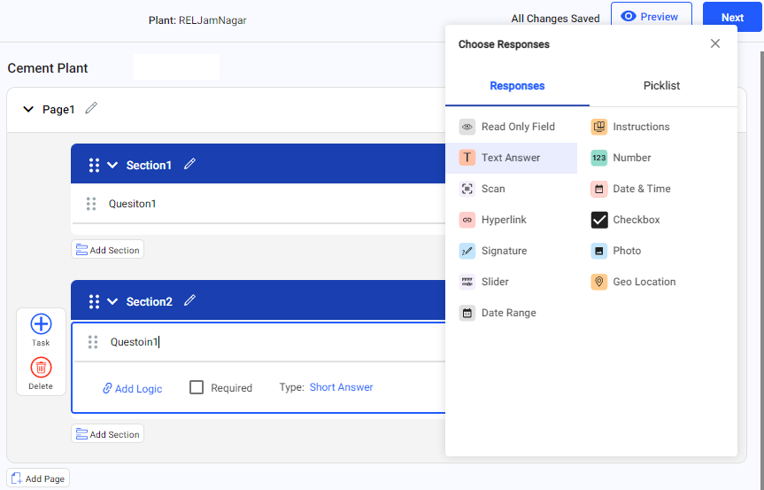 Add tasks with logical questions under each section with different response types along with required conditional logic.