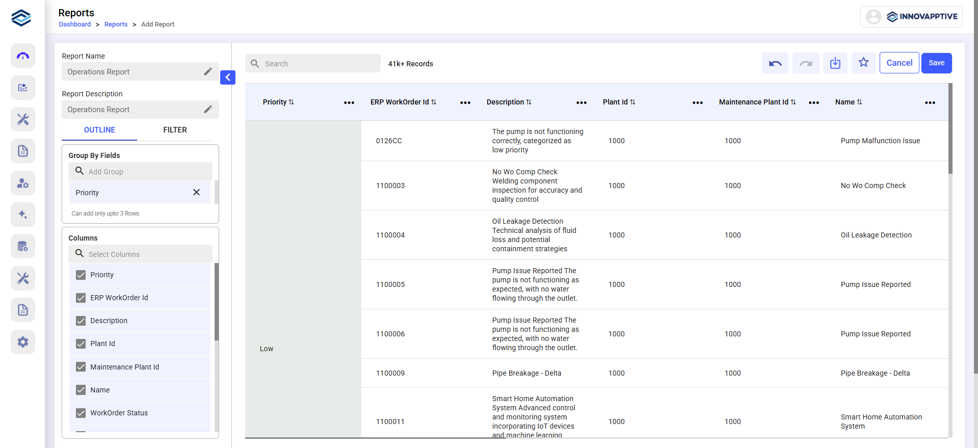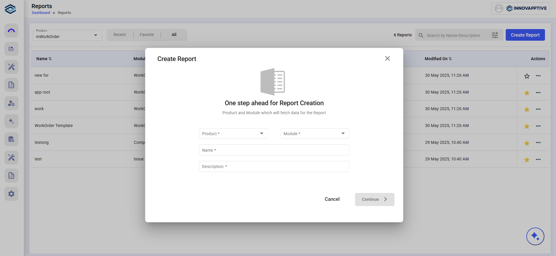 Reports allow you to generate detailed insights using business objects such as Work Orders, Components, Operations, and Issues.