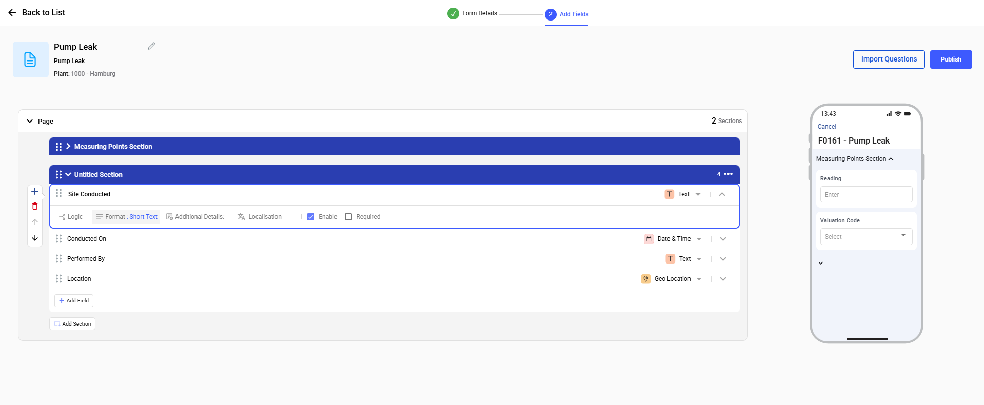 - Insert Fields (Questions) into sections.