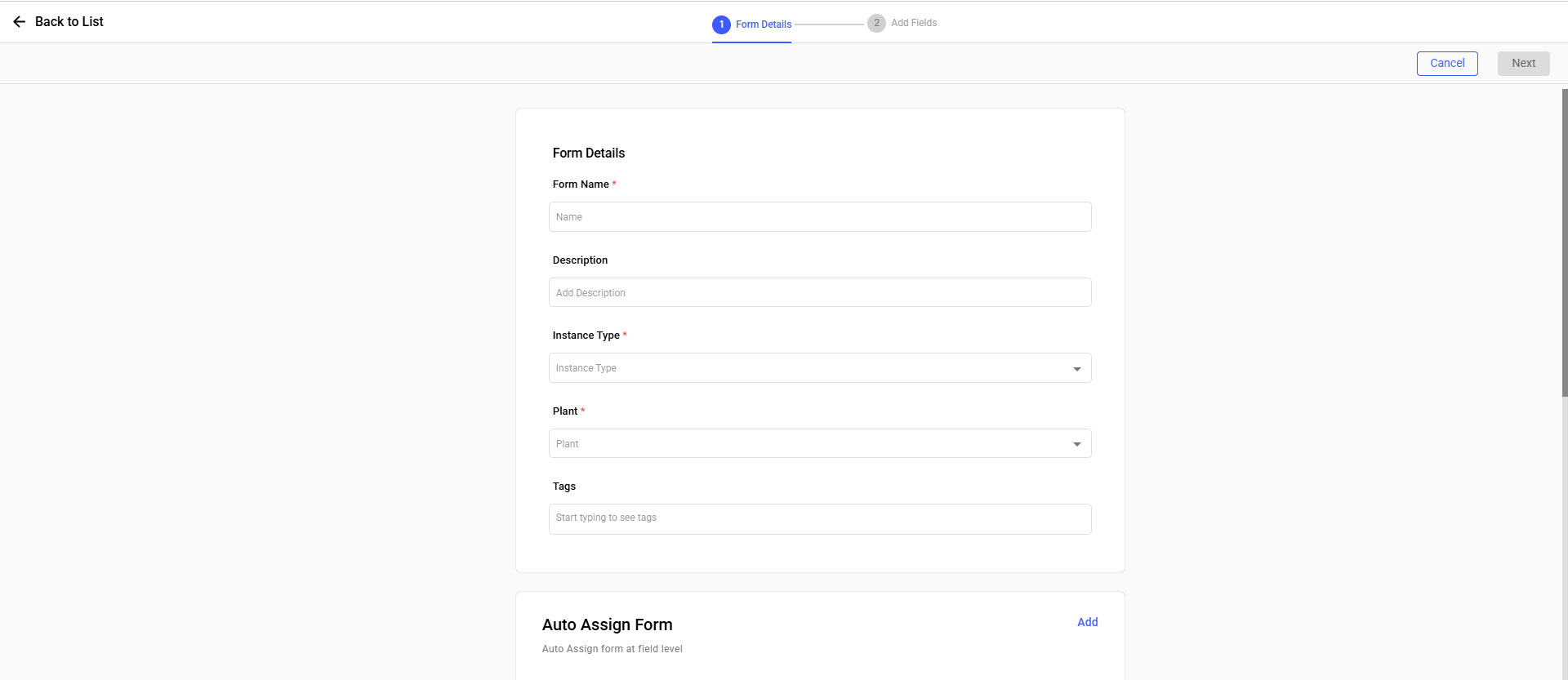 Field Description Form Name Enter a name (e.g., Equipment Inspection). Description Describe the purpose of the form. Instance Type Select Single or Multiple Instance. Plant Select the applicable plant. Tags Add tags to categorize the form. Auto Assignment of Forms Assign Forms based on Equipment, Functional Location, Tasklist, Maintenance Plan and Work order Type. Measuring Point Section Add Measuring Point category of Equipment and Functional location. Additional Details (Optional) Add custom fields with Labels (max 25 chars) and Values (max 40 chars). Figure 1. Add Form Details