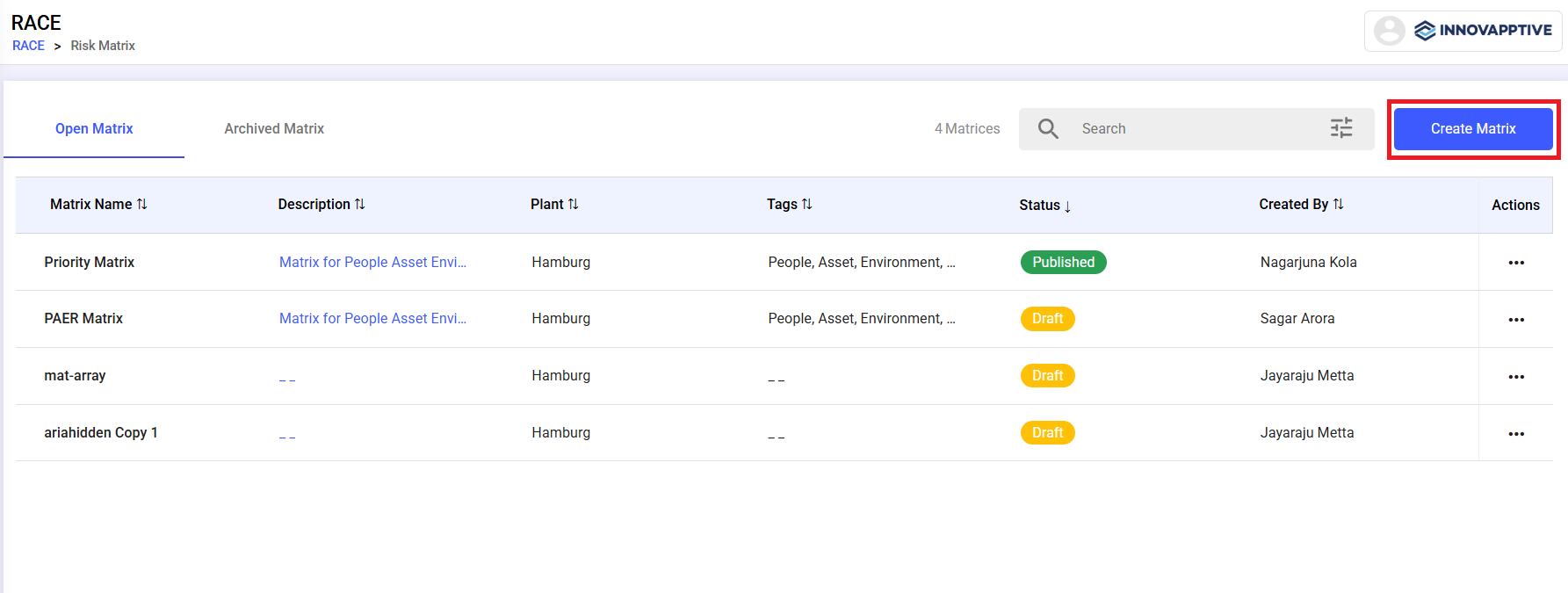 - Navigate to RACE and select Risk Matrix.