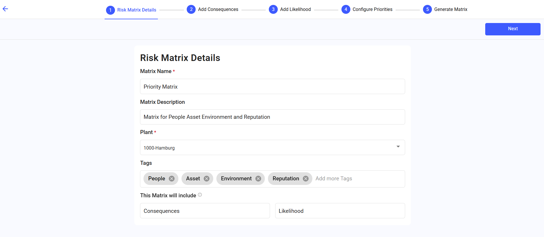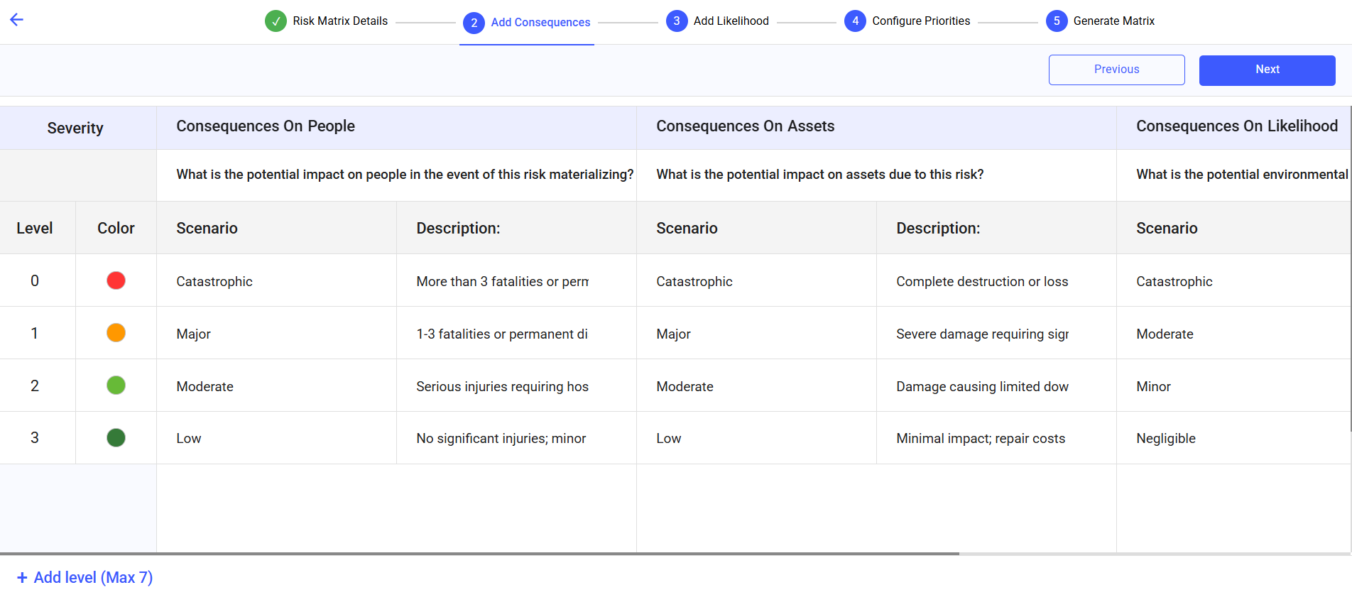 - Define up to 5 consequence categories (e.g., People, Assets,