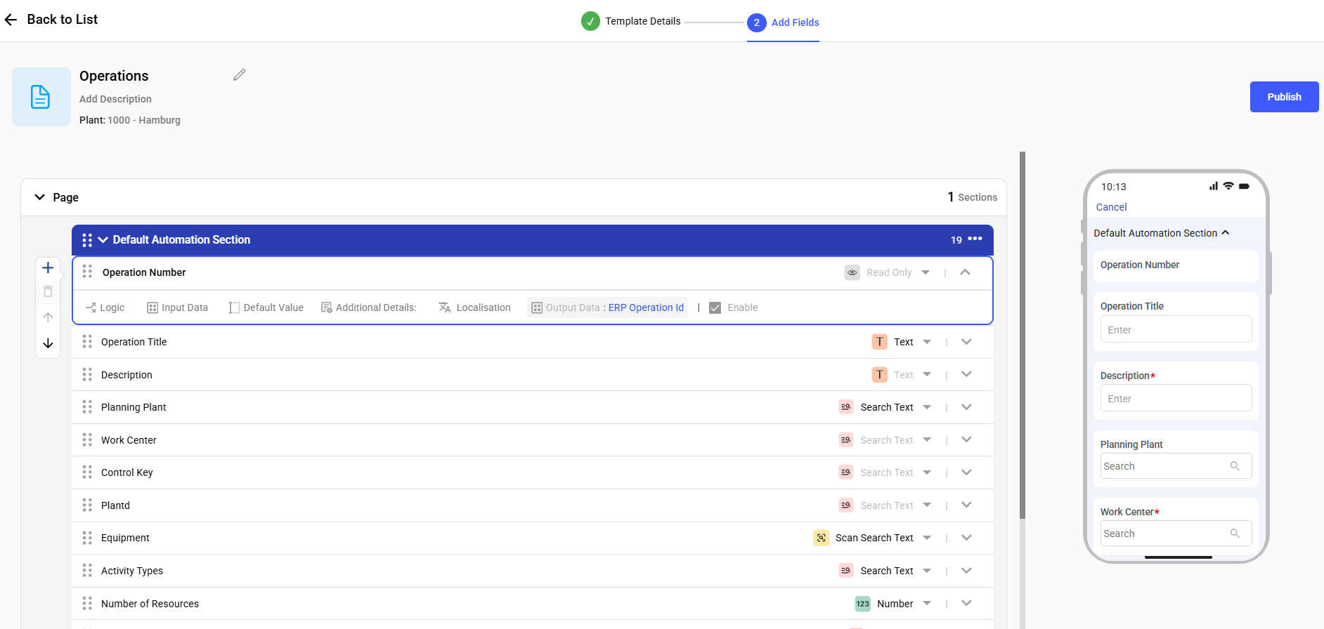 Operations define the individual tasks within a Work Order. As an Admin or Supervisor, you can customize the Operation template using OOTB fields. Each Operations template is linked to its corresponding Work Order template for consistent task management.