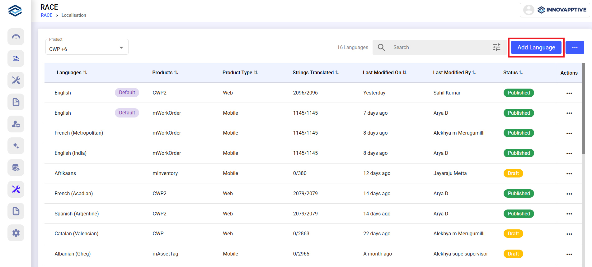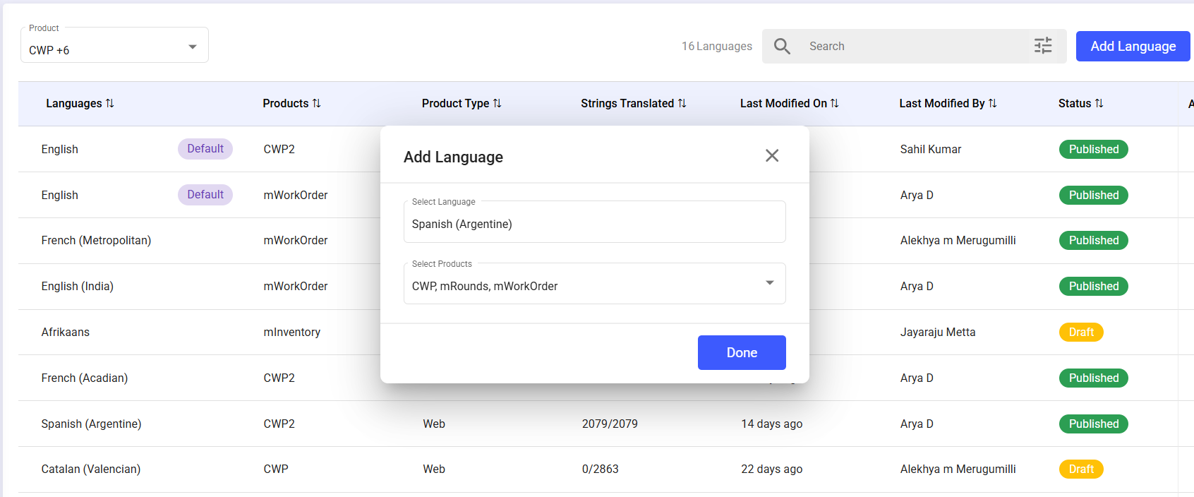 - Select the Product drop-down to view All Products or individual products (e.g., CWP Web, iMaintenance Mobile, etc.) By default, the filter is applied to ‘All Products’, showing all languages across all products.