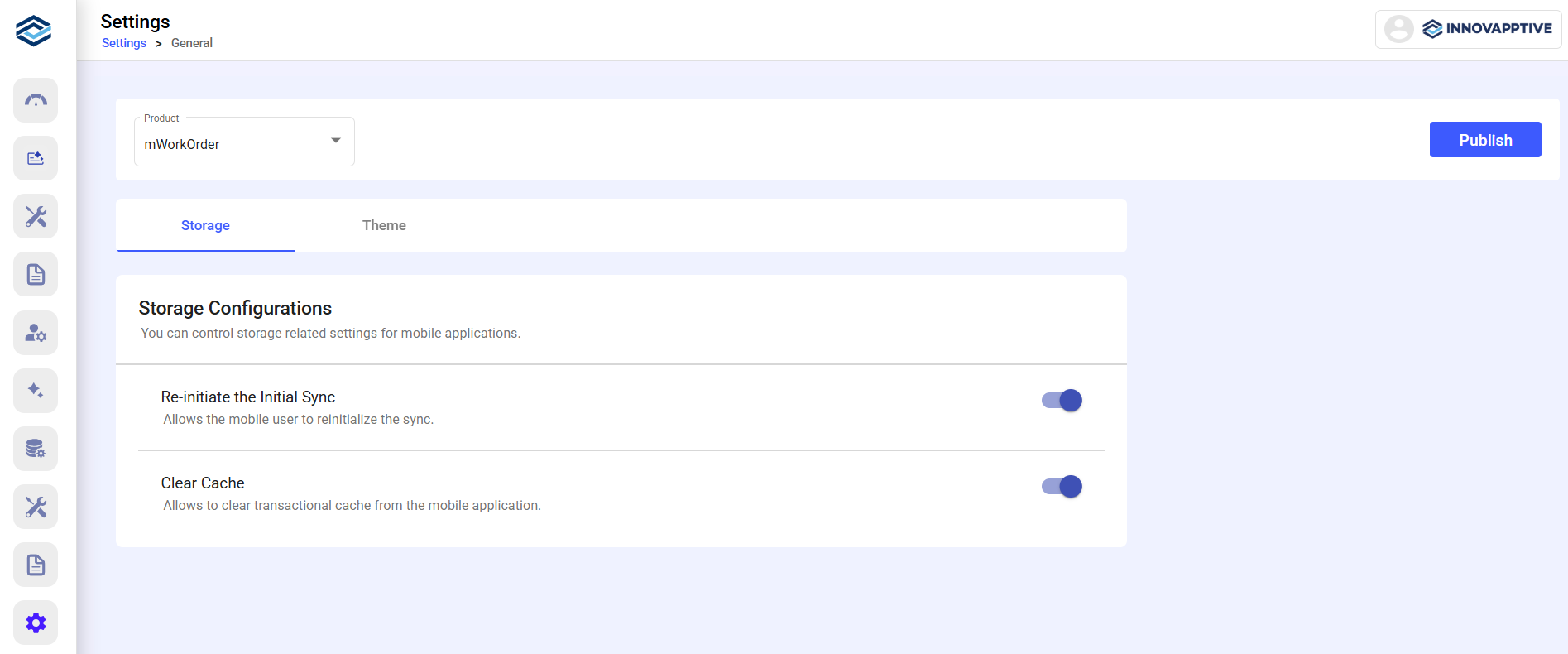 It has two primary options:Once enabled and published the settings, they are applied to the selected product (e.g., iMaintenance) within the mobile application.Setting Description Re-initiate Initial Sync Enables mobile users to trigger a full sync with backend systems, useful when resolving sync issues or applying new configurations. Clear Cache Adds a "Clear Cache" button in the mobile app, allowing users to delete local data (junk/temporary files) to improve performance.