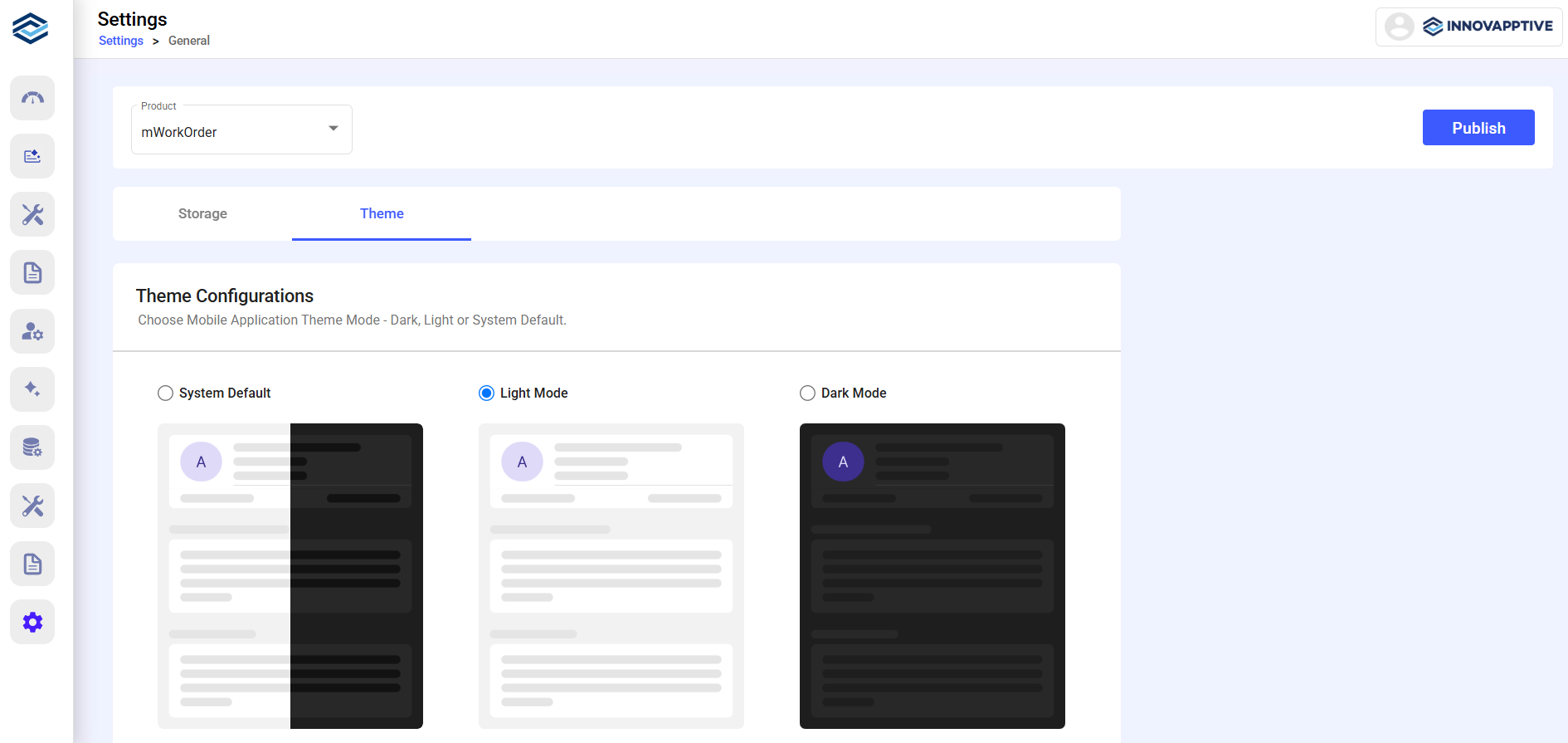 You can choose from the following mobile theme modes:Mode Description System Default Uses the theme based on the user’s device setting (light/dark mode) Light Mode Clean, bright interface with dark text—ideal for daylight use Dark Mode Low-light UI for night shifts or dim environments (e.g., mining, manufacturing) Theme preferences apply globally for that product once published.