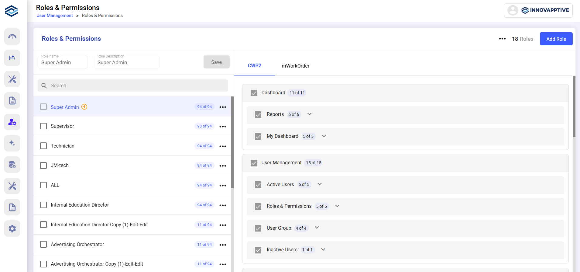 Roles determine which modules and features a user can access. Each role can be assigned specific permissions for either CWP 2.0 or iMaintenance.