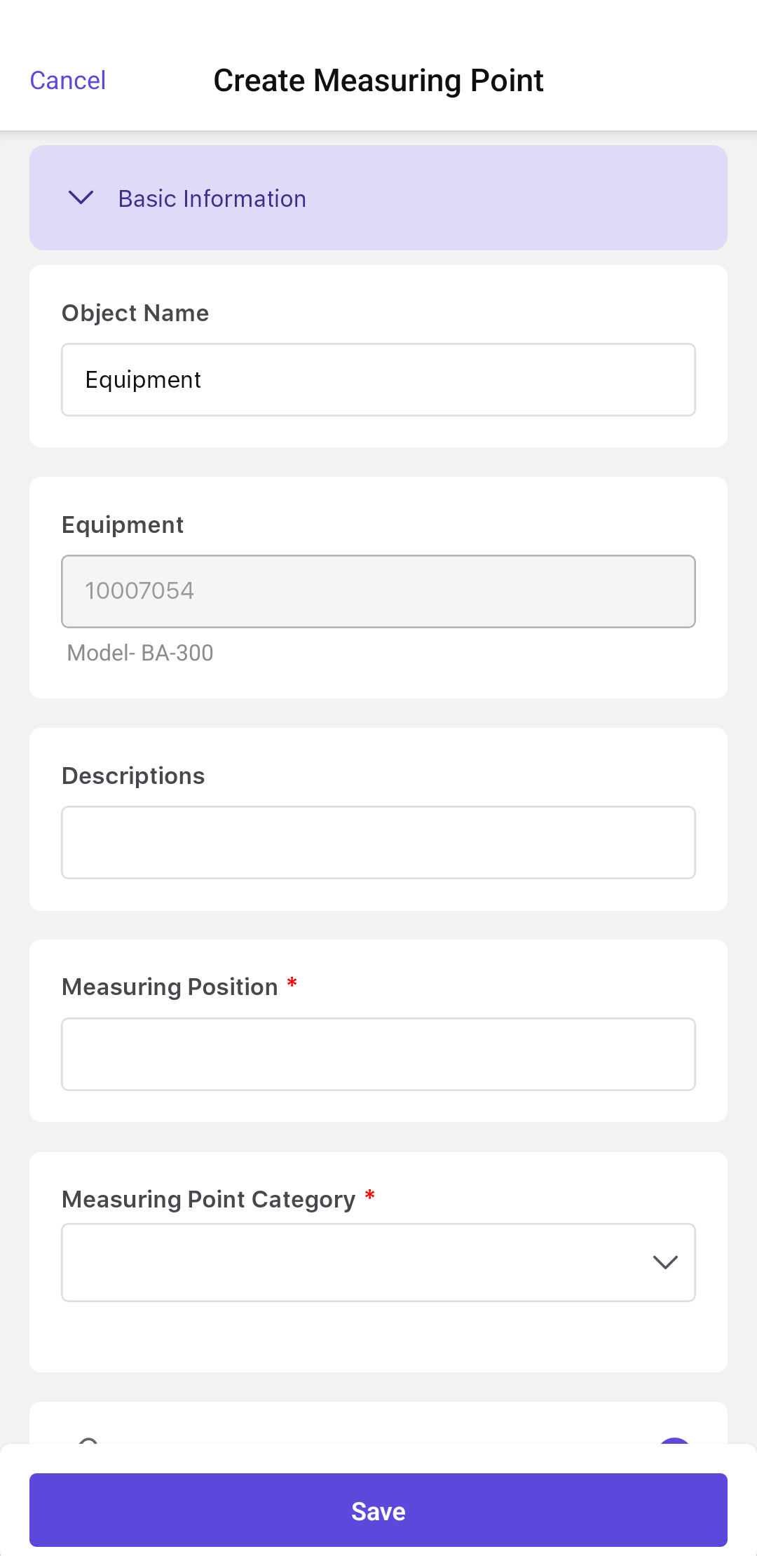 In the Create Measuring Point screen, enter the following details: