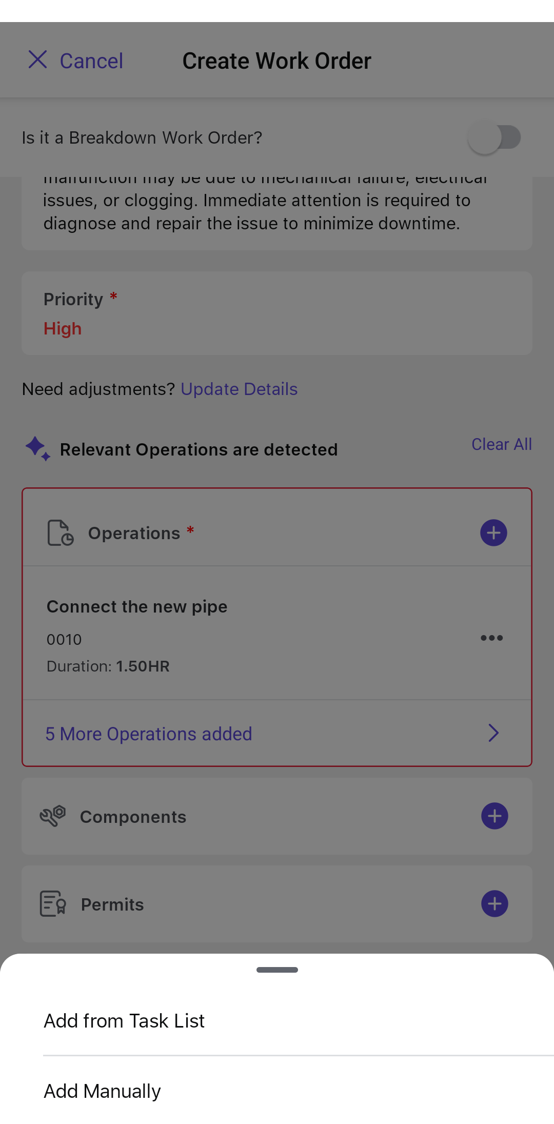 - Add Attachment to add images, videos, and documents. You can also view Work Order and Operation level attachments in those sections.