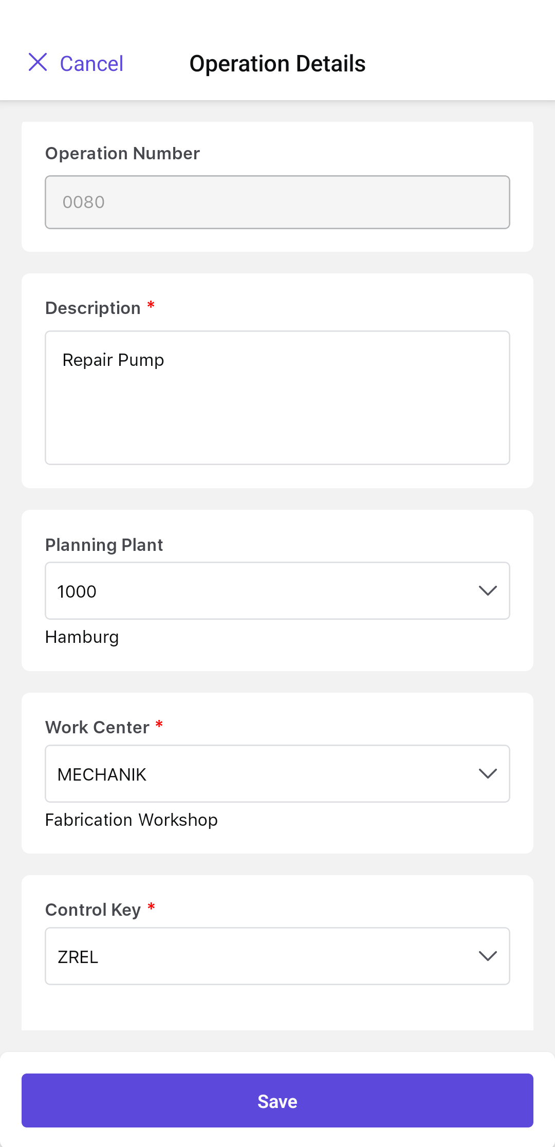 - Control Key (Automatically populates based on Work Order type and Planning Plant)