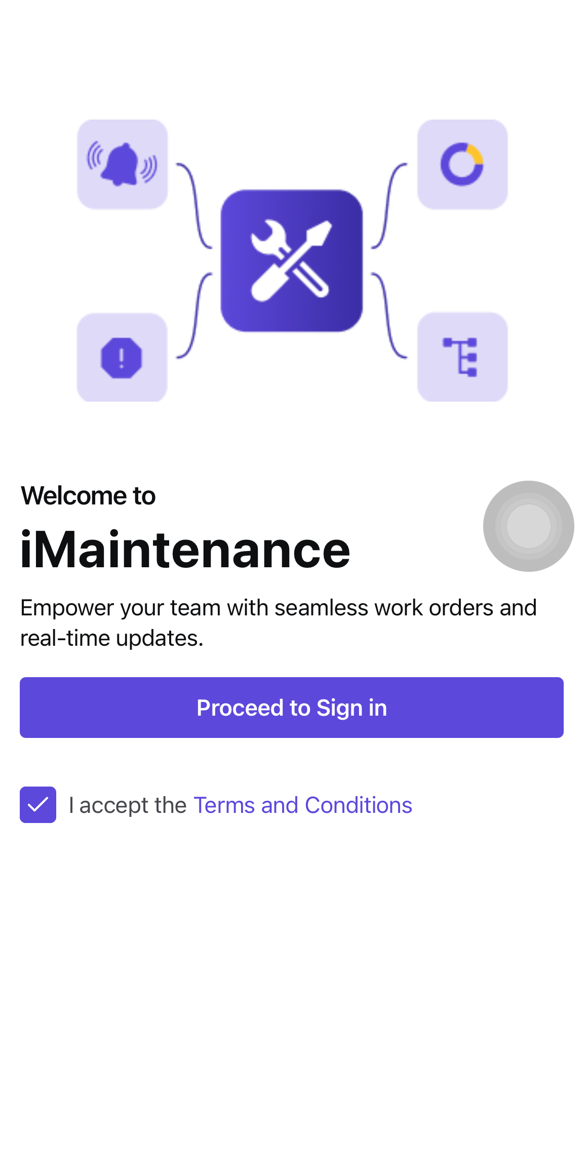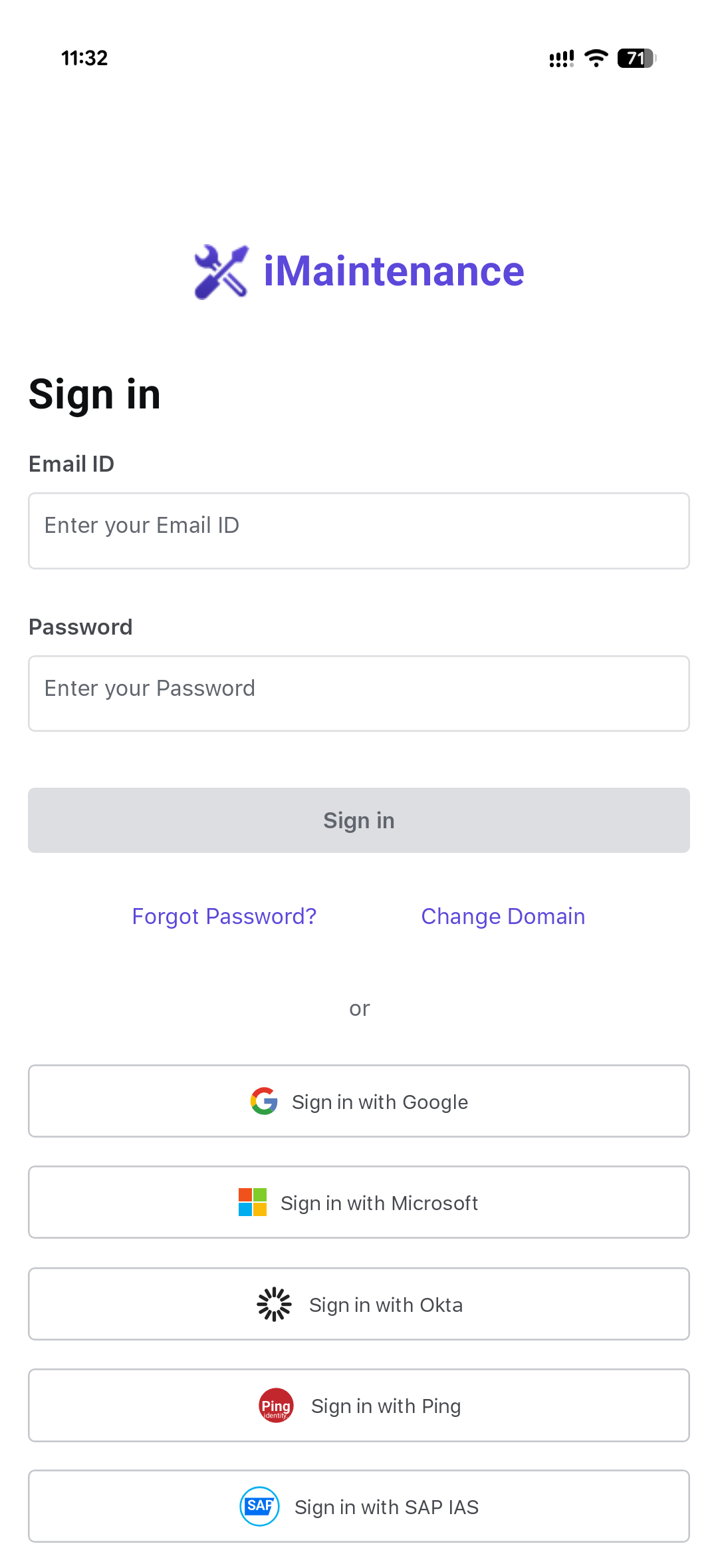 Log in to the iMaintenance application securely using a standard login procedure which involves entering a company or domain, username, and password.