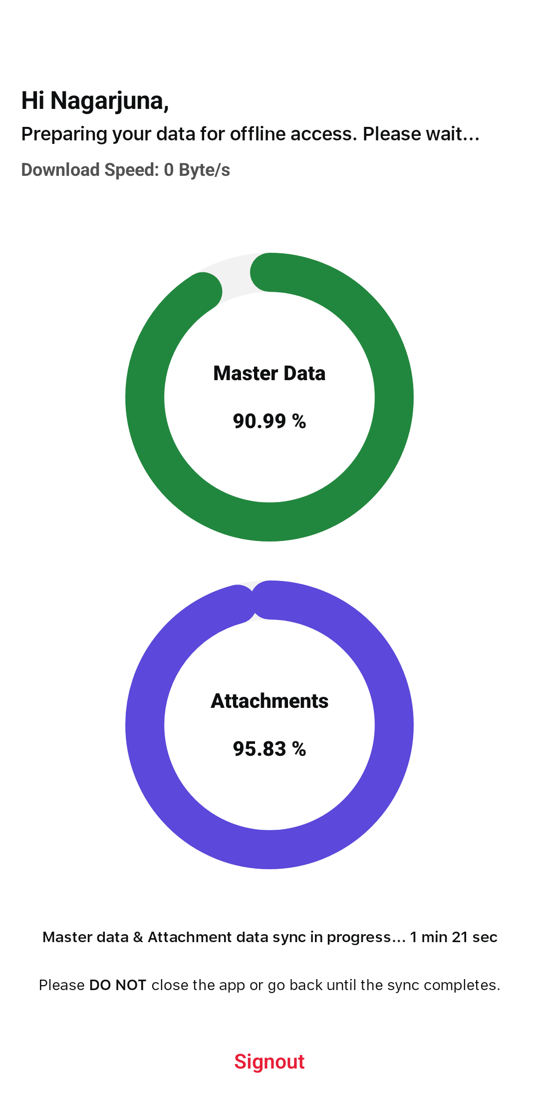 The application syncs the data, including master data and attachments for offline access, and displays the Home screen.Figure 1. Offline Sync
