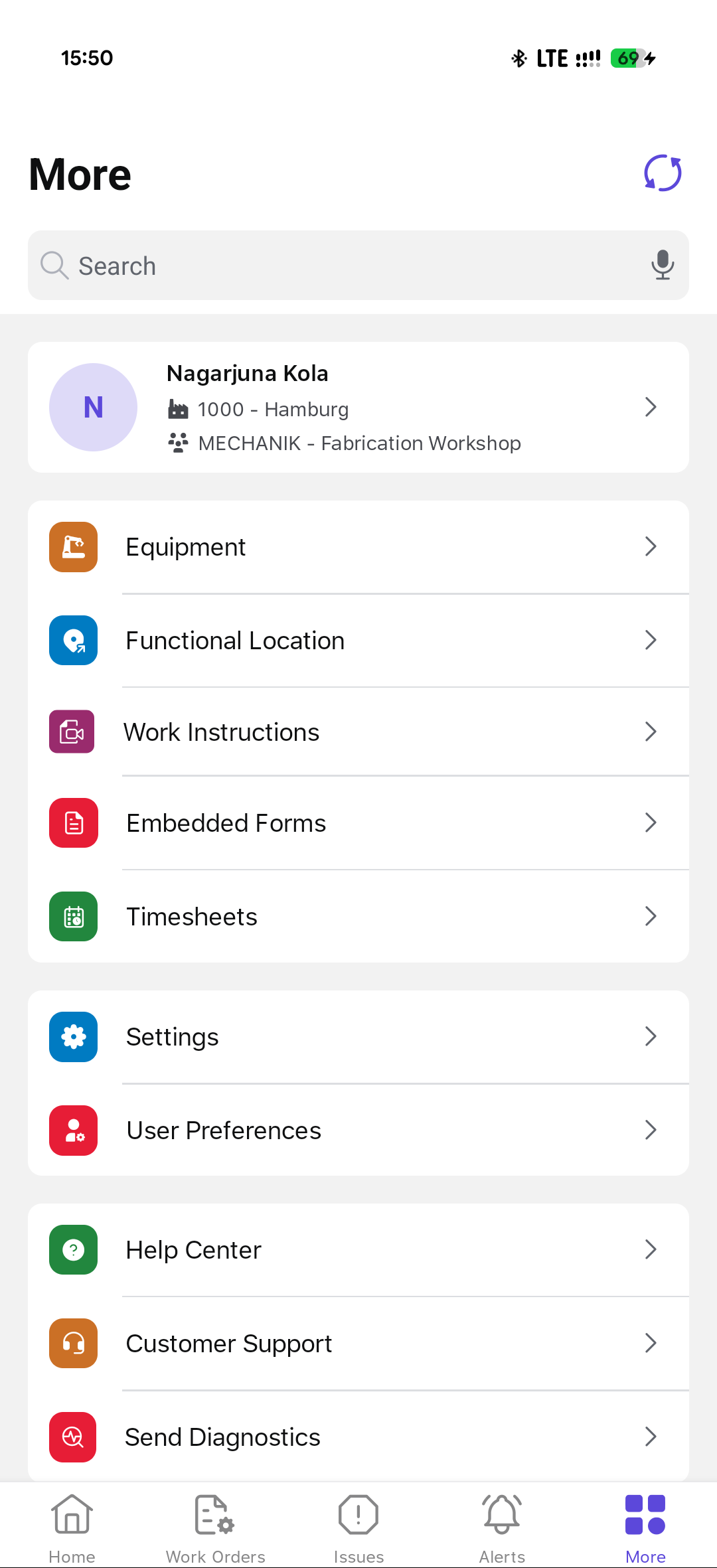 The More screen provides access to additional features and settings, allowing users to manage their profile, customize preferences, and access support resources. It includes essential tools that enhance functionality and streamline work order management.