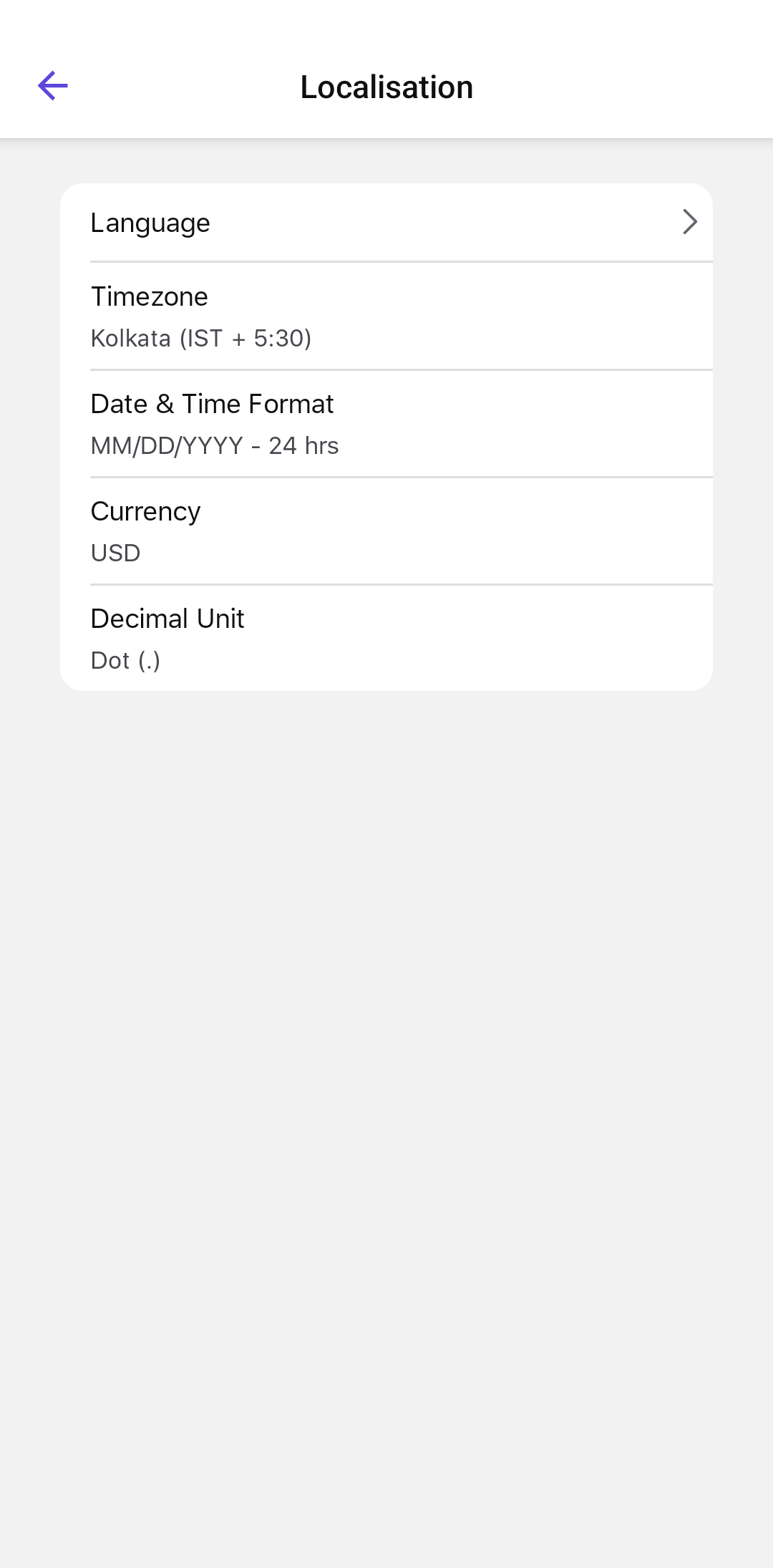 - Time zone, Date and Time Format, Currency, and Decimal Unit updates based on the selected language.