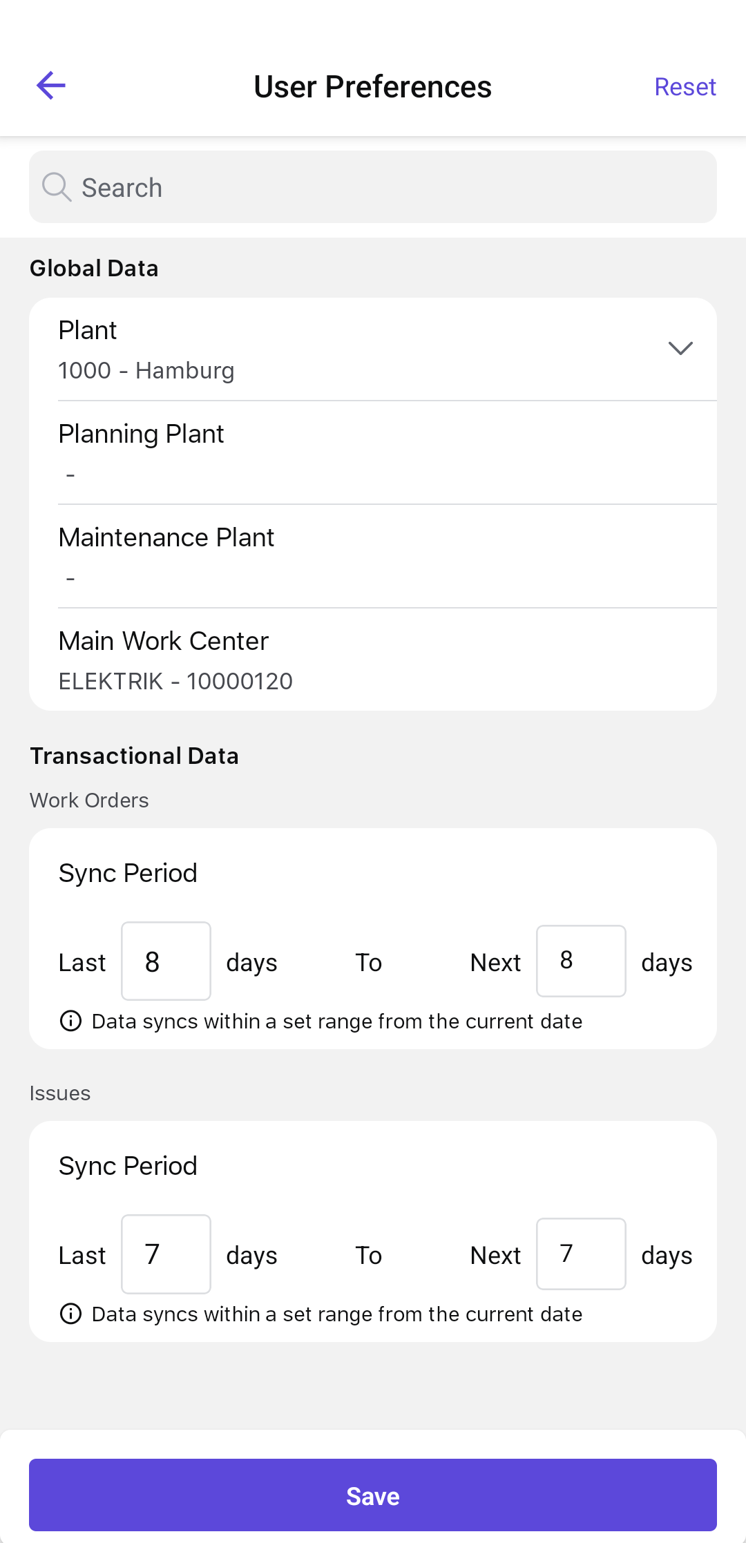 Optimizing your data sync settings helps you access relevant work orders and issues quickly while improving app performance. By selecting your plant and defining a sync period, you ensure that only necessary data is loaded, reducing unnecessary processing time and keeping information up to date.