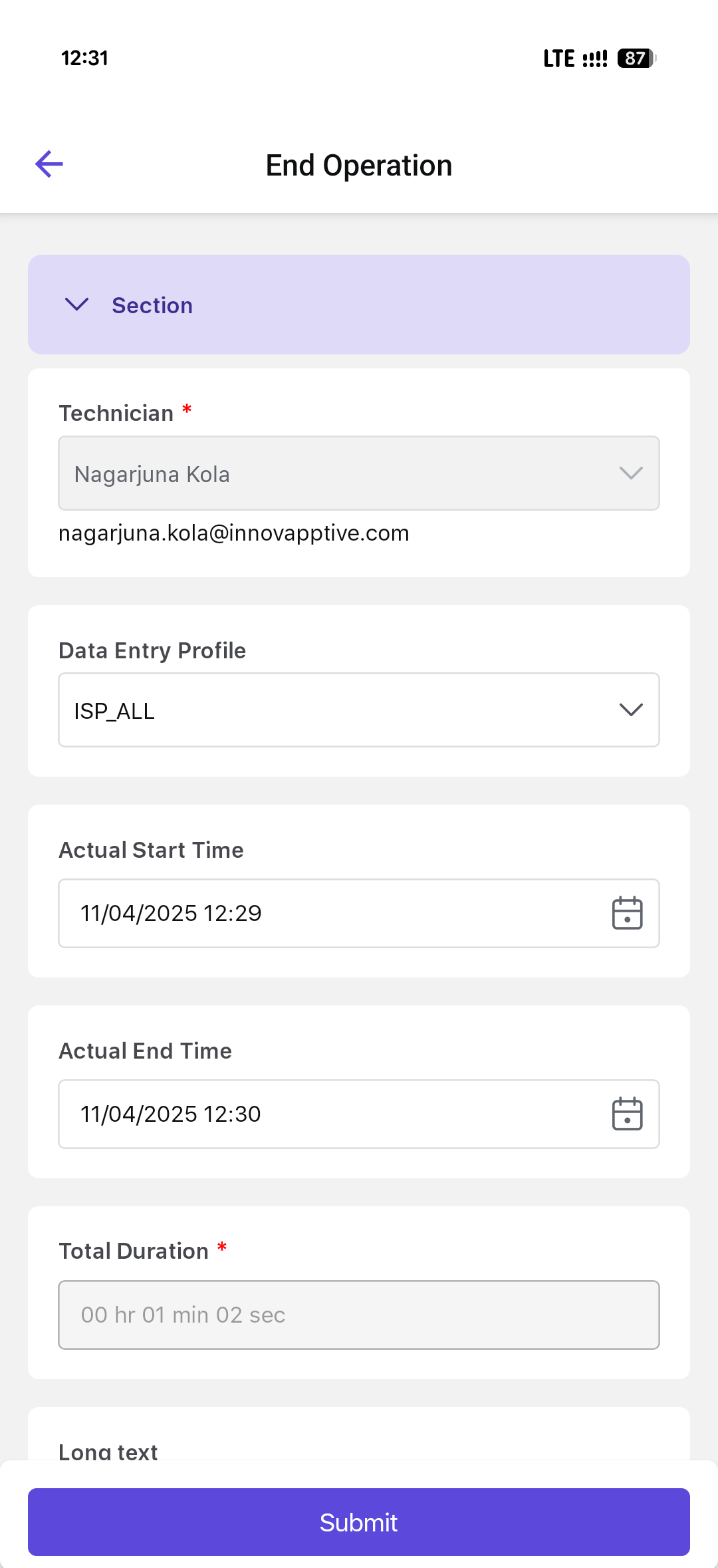 The auto timer tracks your wrench time—the actual time you spend working on the operation. Supervisors use this to compare planned vs. actual time, which improves scheduling accuracy and resource planning.